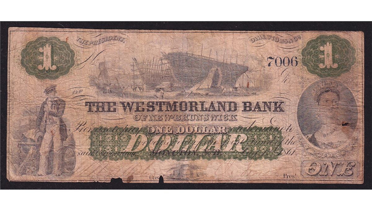1861 Westmorland Bank $1 - CH 800-12-02, VG, pieces missing at bottom and at right, S/N:7006/B.