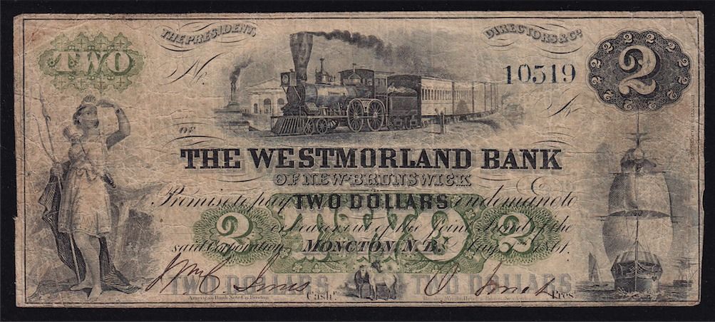 1861 Westmorland Bank $2 - CH 800-12-04a Clean Fine with a few pinholes. S/N:10519/A.
