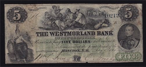 1861 Westmorland Bank $5 - CH 800-12-06a, Fine, pressed with a few pinholes, S/N:10212/A.