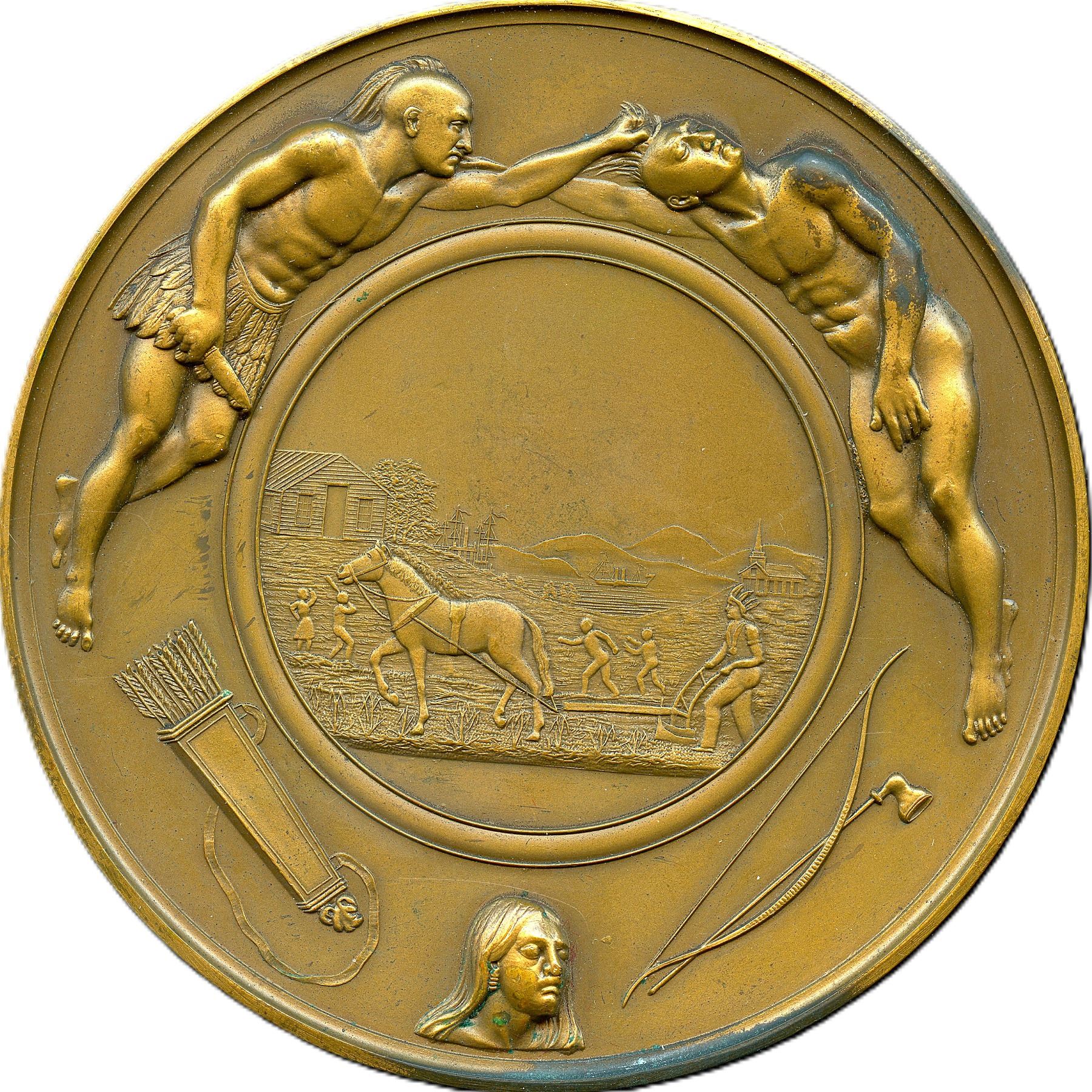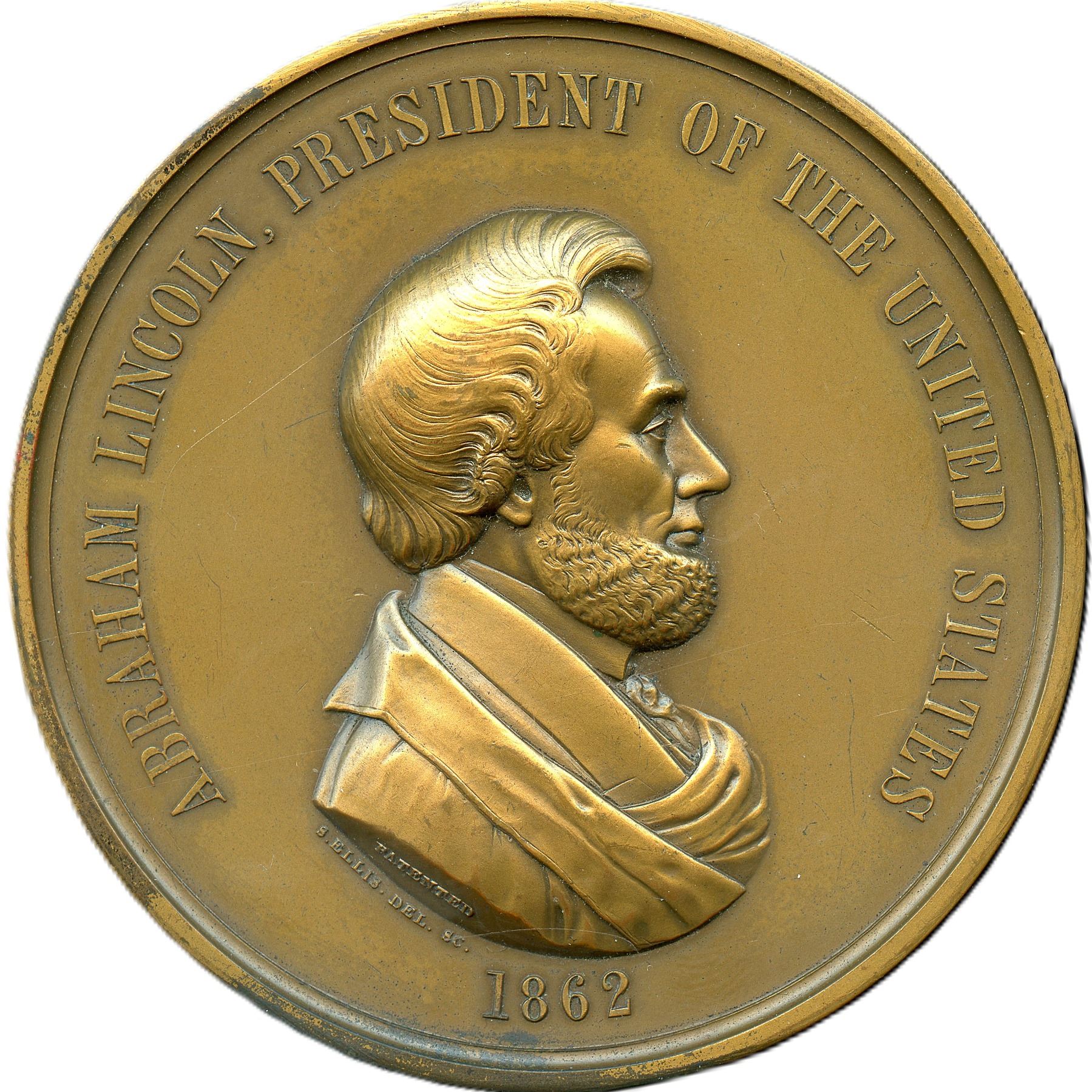 1862 Abraham Lincoln Indian Peace Medal Restrike Bronze. 69.6mm, 233.1g. Obverse right-facing bust of Abraham Lincoln, surrounded by the inscription "ABRAHAM LINCOLN, PRESIDENT OF THE UNITED STATES" and dated "1862" below, engraver marked "S. ELLIS. DEL. SC." (Salathiel Ellis) and marked "PATENTED" at the base of the bust, Reverse is not signed, illustrating a Native warrior brave scalping another, the head of an Native woman at the bottom, flanked by a quiver of arrows to the left and a bow and a peace pipe to the right, surrounding a central circle encasing the image of a left-facing Native in feathered headdress plowing a field with a horse leading the way, a depiction of children playing baseball in the background, along with ships in the harbour, a church, a homestead and mountains in the distance. Green verdigris on the Native woman at the bottom as well as , rim below. EF. Ex. Wm. John Keast (1893-1948)