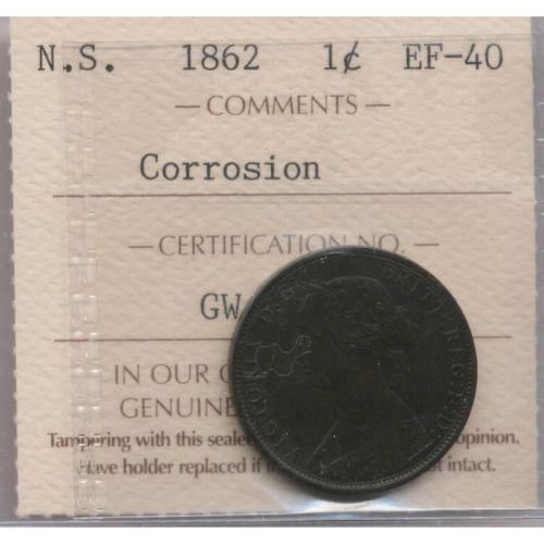 1862 Nova Scotia one cent ICCS EF-40 Key Date<BR><BR>Key Date, corrosion noted by ICCS, extremely high grade for this coin, only a dozen graded higher, value in this coin!