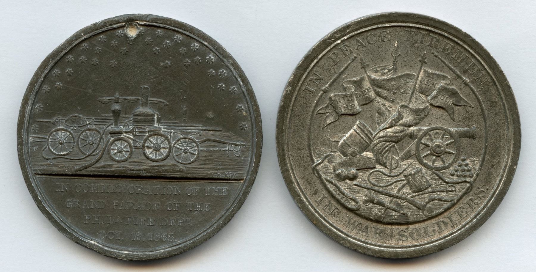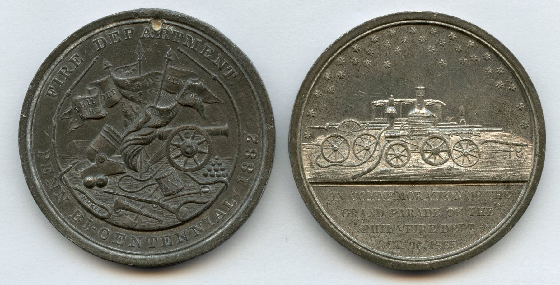 More than 100 fire companies with 20,000 firefighters marched in the 10-mile parade route. Second piece is the 1882 Penn Bi-Centennial Fire Department. 2 pcs.
