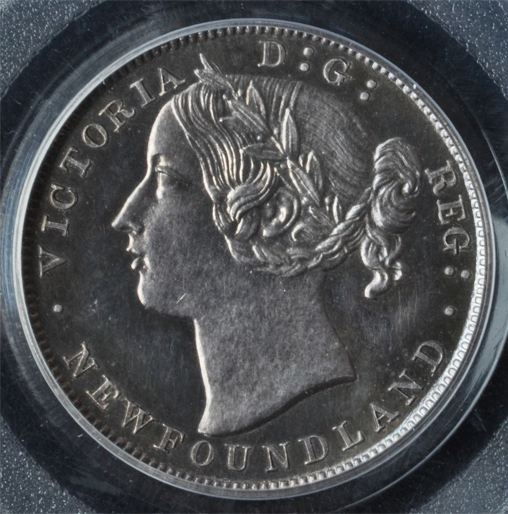 1865 Newfoundland Twenty Cent Pattern - CH NF-13, Bowman No. unlisted. PCGS SP63+. Silver 4.5 grams. As stated in Charlton "the adopted design, except for some details of the arches and the presence of a raised line just inside the rim denticles" superbly struck with brilliant surface and great eye appeal. Ex:Temple.