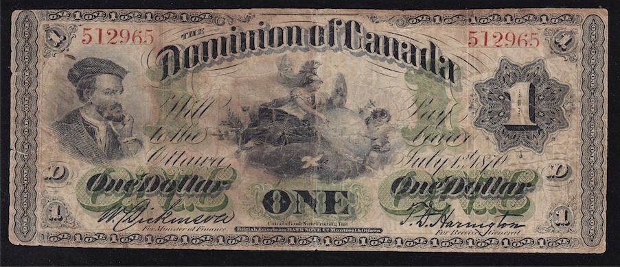 1870 Dominion of Canada $1. DC-2b-i. Large date. Pressed Fine, couple edge tears on left side. S/N:512965/D.