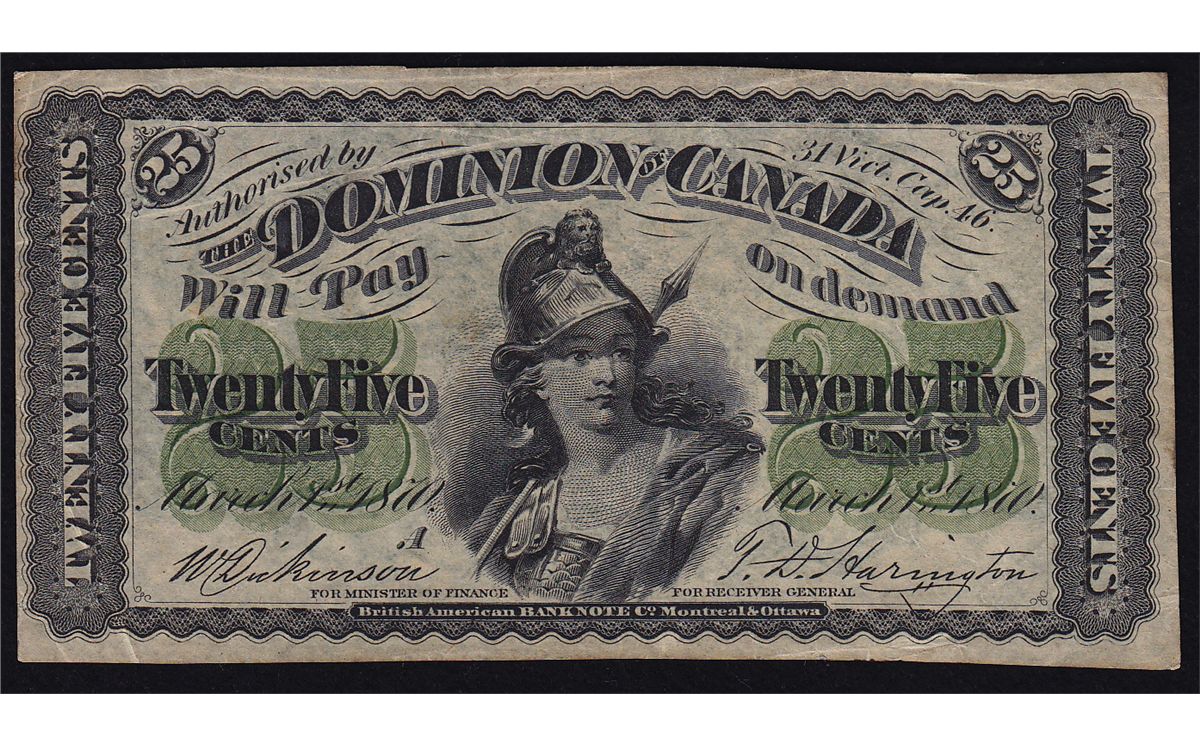 1870 Dominion of Canada Twenty Five Cents - CH DC-1a Tough Series A Shinplaster. VF, pressed.