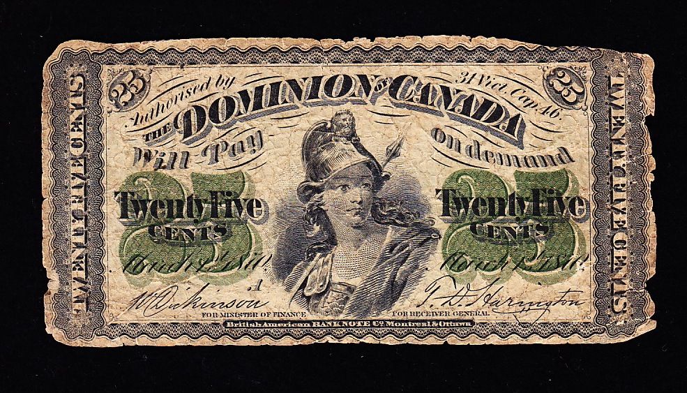 1870 Dominion of Canada Twenty Five Cents - CH DC-1a, Scarce Letter A series, Good with tattered edges.