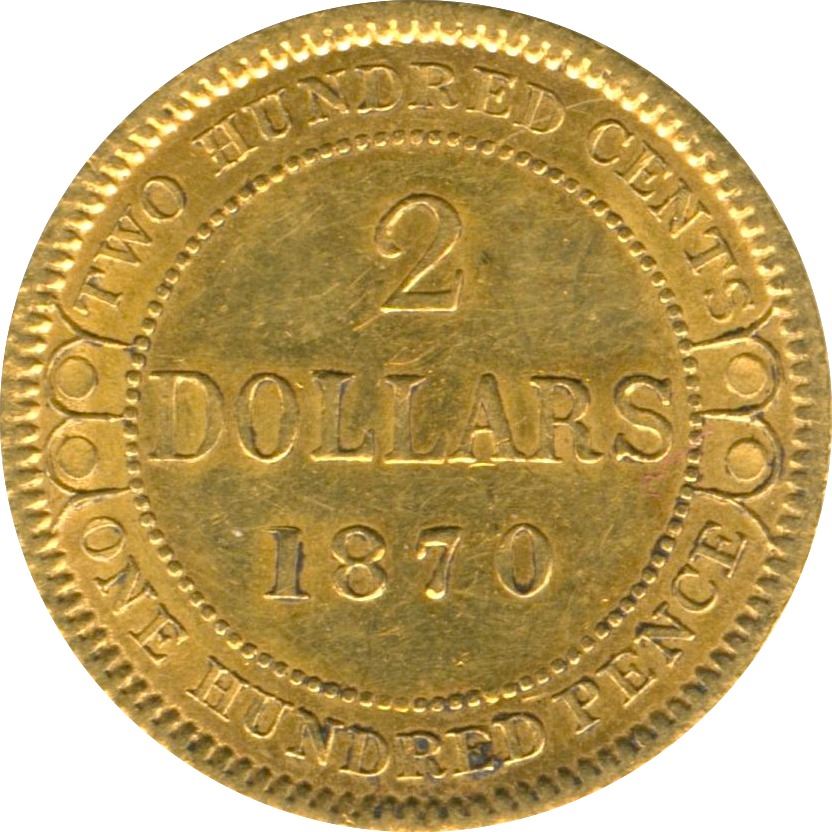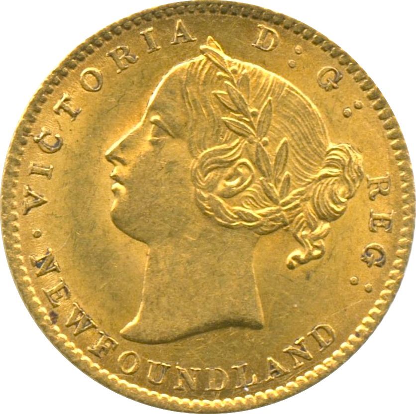 The Newfoundland $2 gold coin, issued intermittently between 1865 and 1888, is a small (17.98 mm, 3.33g) .917 fine gold coin featuring Queen Victoria, renowned as the only gold circulation currency issued by a British colony. The reverse exhibits some light wear, the obverse is a nice AU/AU+