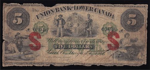 1871 Union Bank of Lower Canada Five Dollars - CH 740-14-04. Featuring choice vignettes with a sailor and coast scene, this is another rarity in G condition with a piece missing at top, does have an internal tear. This is your only opportunity to purchase this rarity as the only other example is in an institutional collection. S/N: 03046/A.