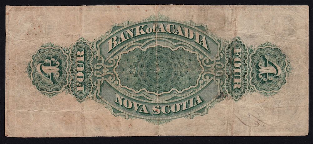 1872 Bank of Acadia $4 - CH 5-10-02 Canada's shortest lived Bank. VF. S/N:0846/B.