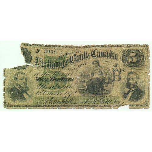 1872 Exchange Bank of Canada $5 Letter B Overprint<BR><BR>Cat #245-10-04a Letter "B" Overprint, only "B" Overprint recorded to date.