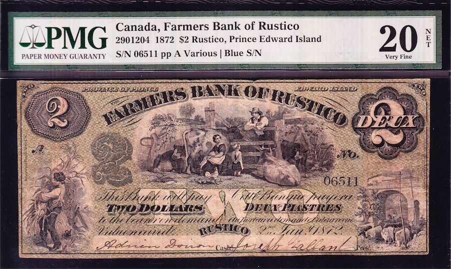 1872 Farmer's Bank of Rustico $2 - CH 290-12-04. PMG VF20 net. Minor rust is noted , certainly one of the better examples of the eleven in the census, S/N:06511/A. From the Geoffrey Bell Collection.