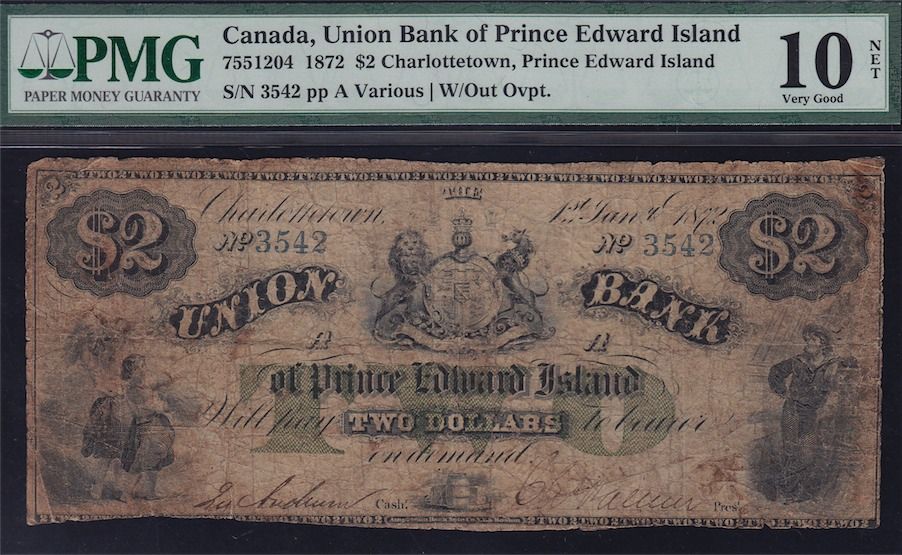 1872 Union Bank of Prince Edward Island $2. CH 755-12-04. PMG VG 10 net. Foreign substance is noted on holder - not certain what that is. This note is unique, no other $2 issue is available with or without overprint. Absorbed by the Bank of Nova Scotia in 1883. S/N:3542/A.