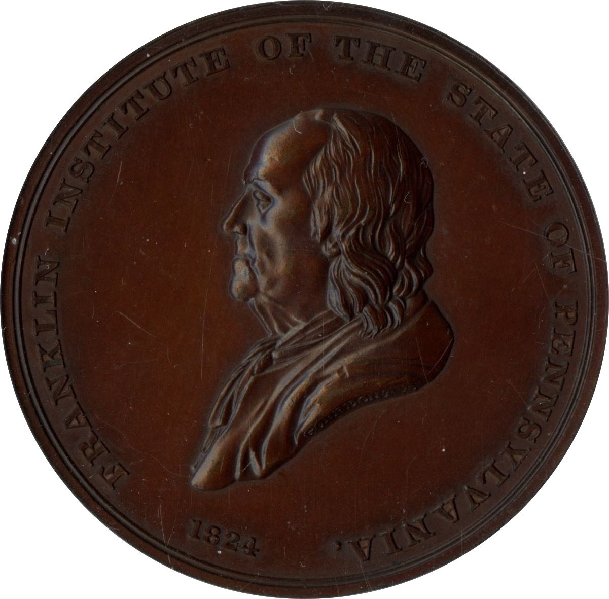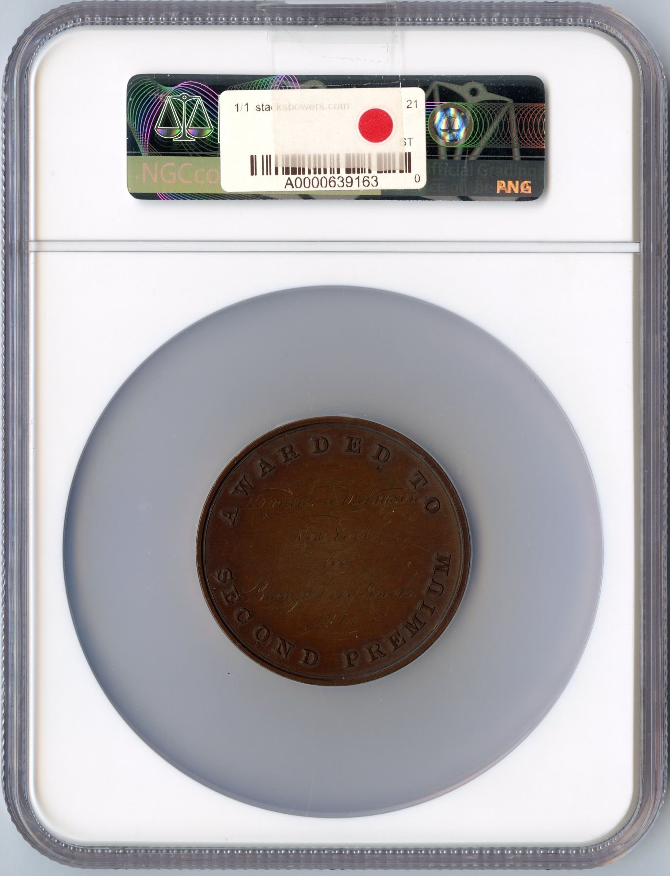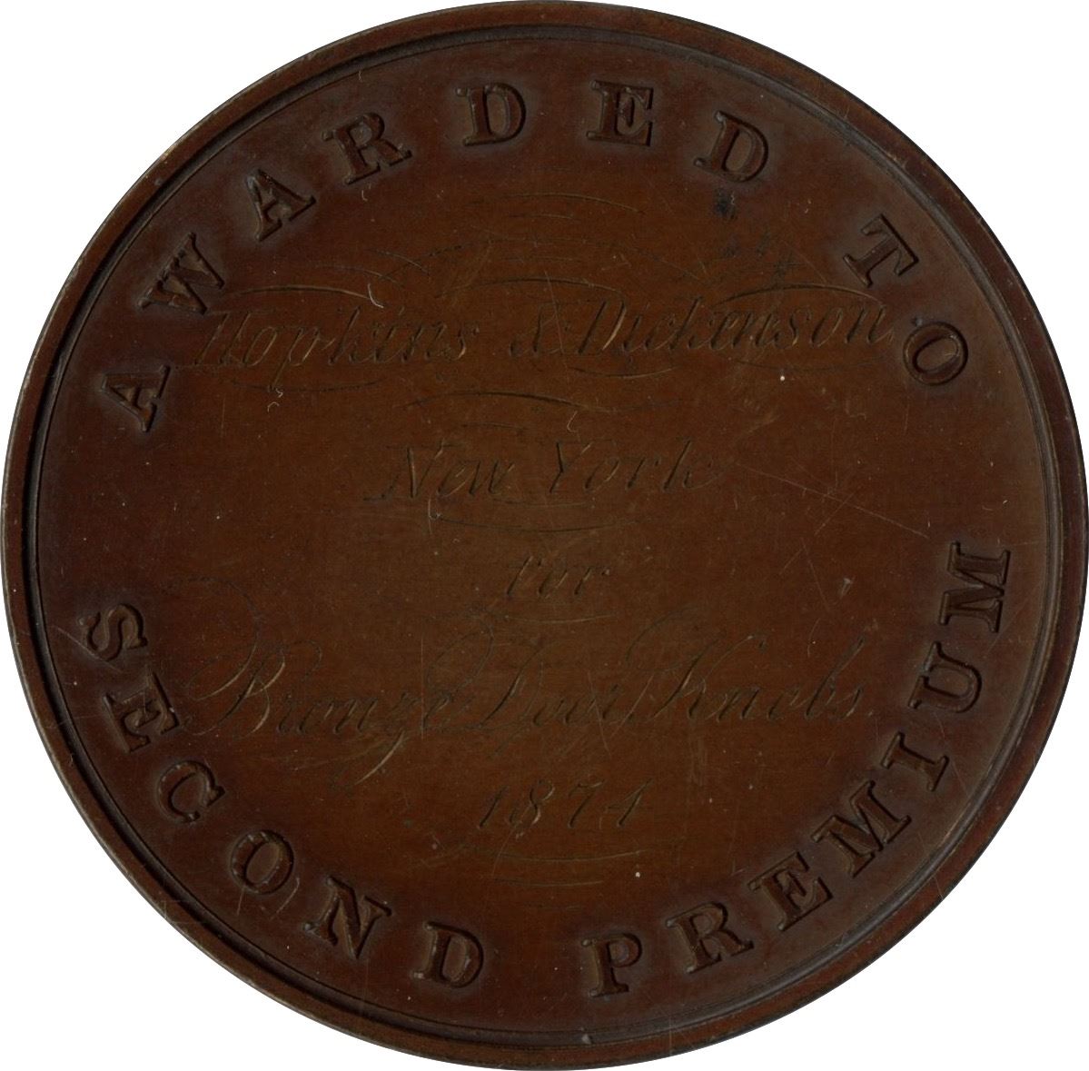 NGC MS63 Brown. Bronze, 51mm. Greenslet GM-94, Julian AM-18, Harkness PA-50. The Franklin institute was founded in 1824. This example was awarded to Hopkins & Dickenson in 1874 for “Bronze Door Knobs.”