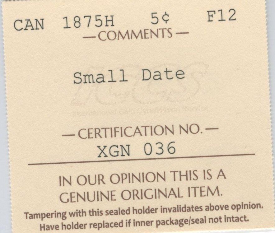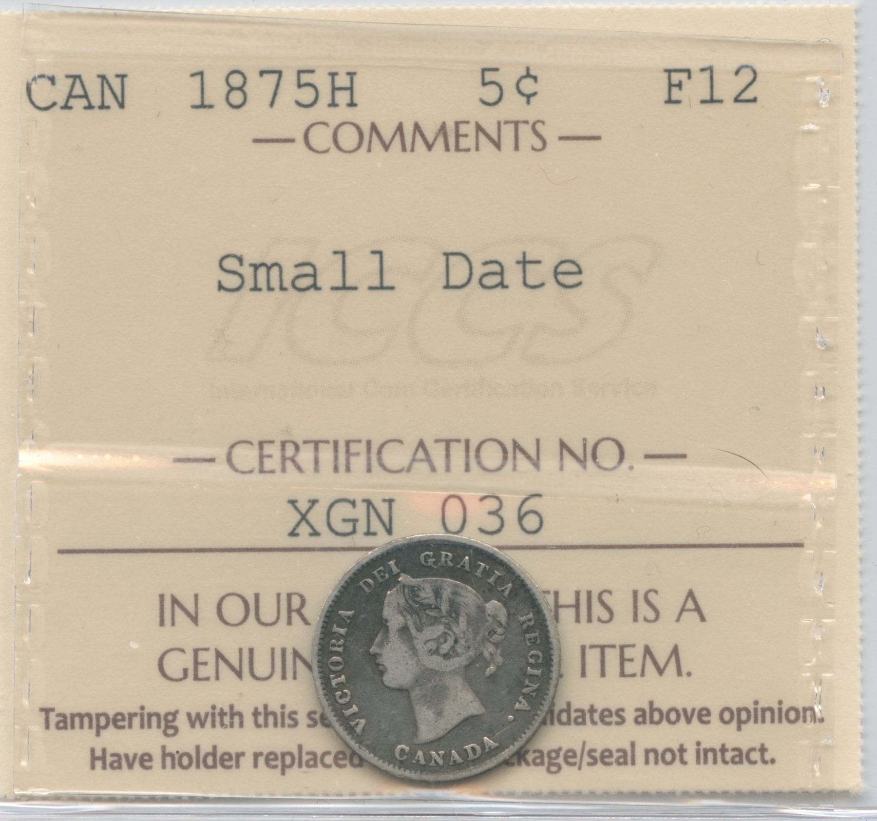 ICCS F12. Small Date. An decent example of this key date in the Victorian Five Cents series.
