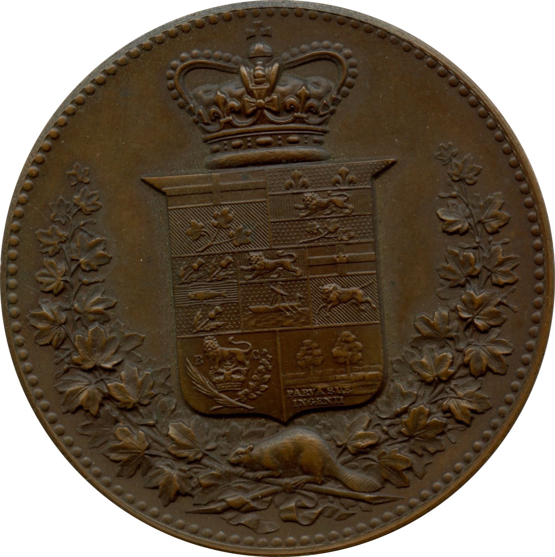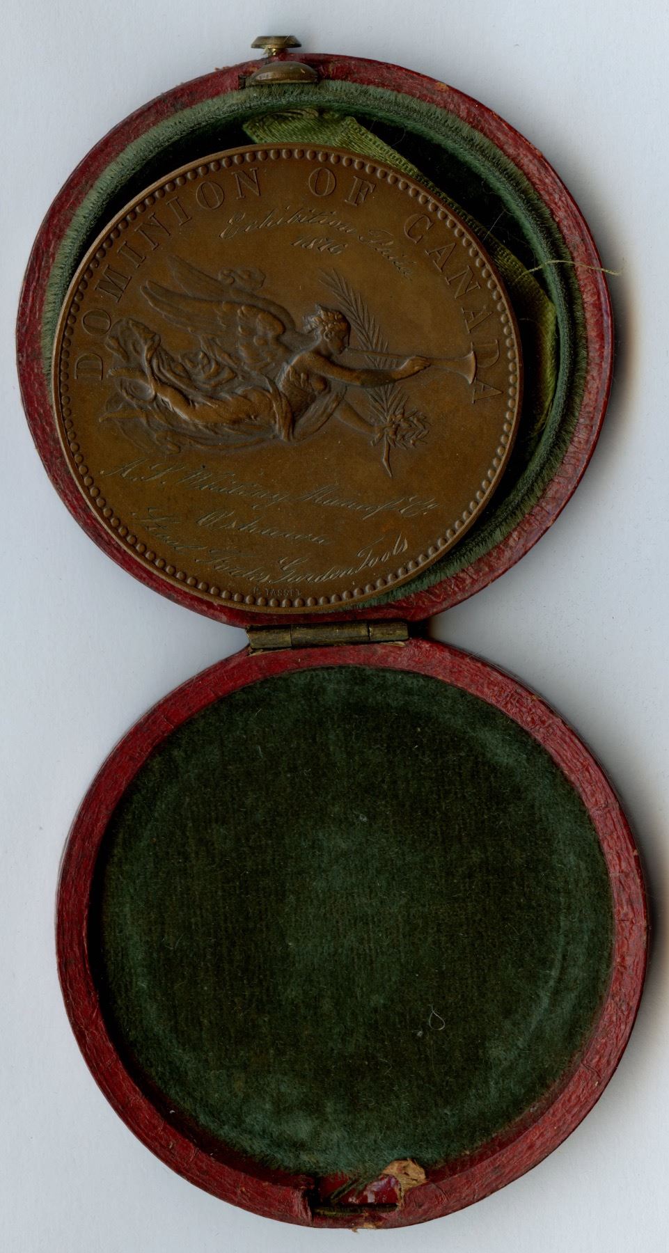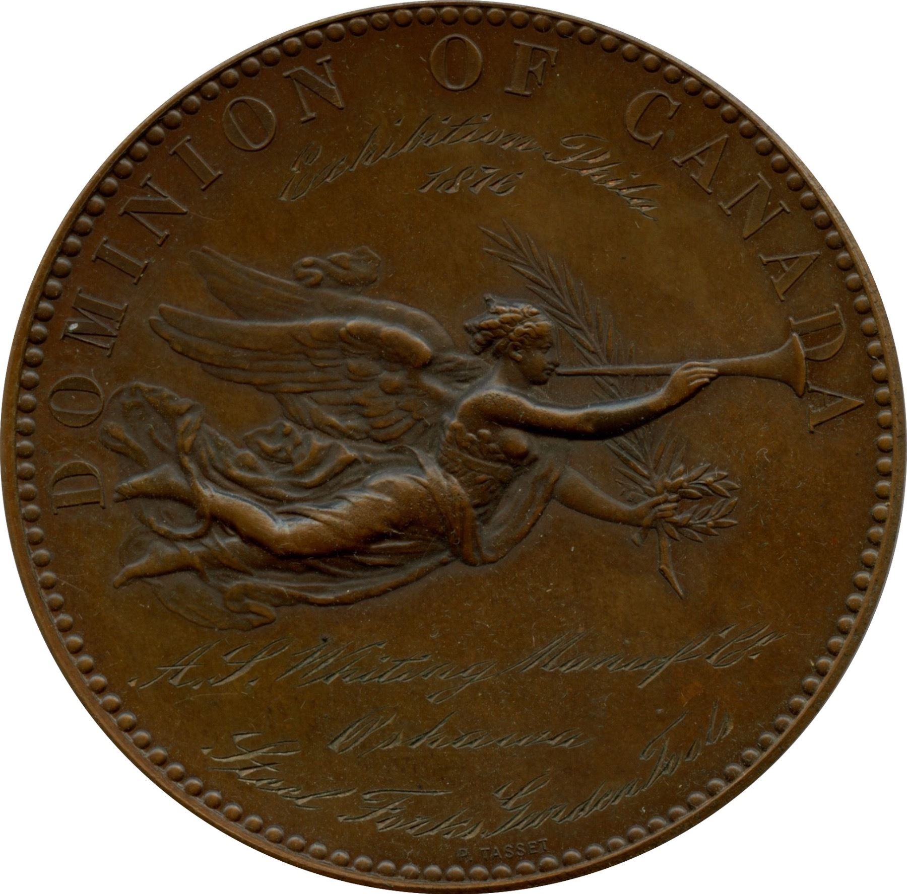 LeRoux-1460, McLachlan-484, Charlton-EDOA-3. Bronze, 42mm. Awarded to winning Canadian Exhibitors by the Commissioners for the Dominion of Canada at the 1876 Philadelphia Centennial International Exhibition. Awarded to A.S. Whiting Manuf Co / Oshawa / Steel Forks Garden Tools