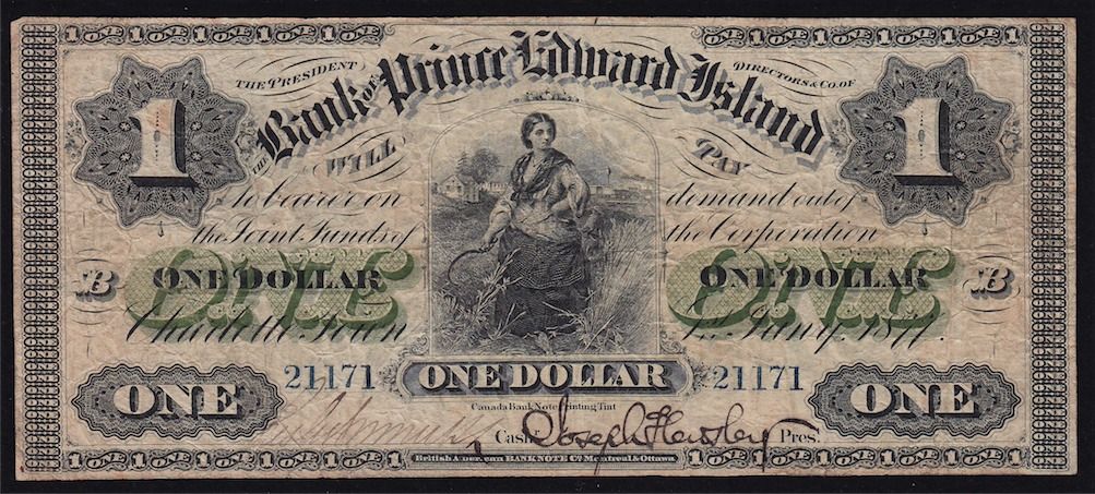 1877 Bank of Prince Edward Island $1 - CH 600-12-04 Fine, one pin hole. S/N:21171/B.