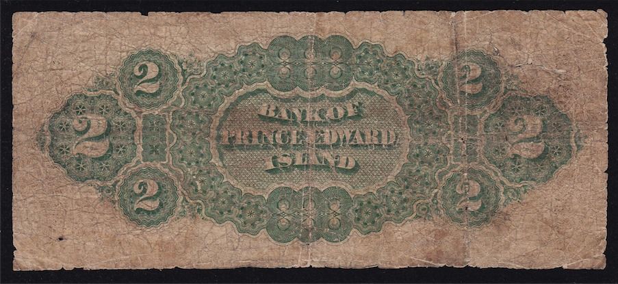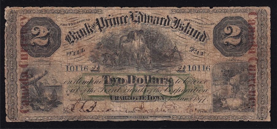 1877 Bank of Prince Edward Island $2 with Vignettes. A scarce 1877 Bank of Prince Edward Island with red "Canada Currency" overprint, Very Good, with two of the three front vignettes. Perfect display piece. 3 Pcs.