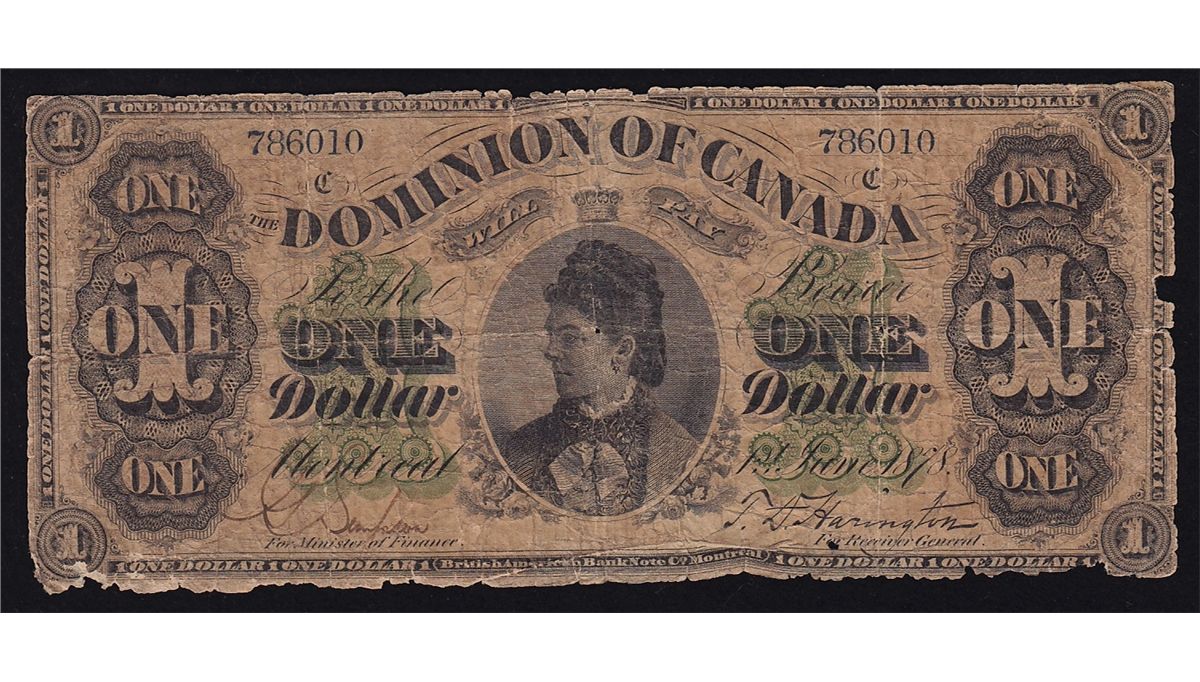 1878 Dominion of Canada $1 - CH DC-8e-iii, Good-VG with foxing & tears on margins, and holes present, S/N:786010/C.