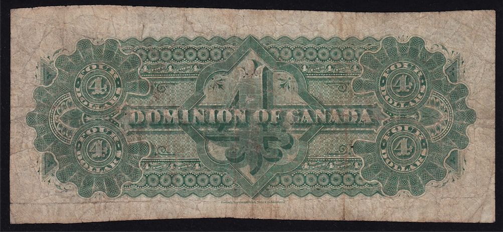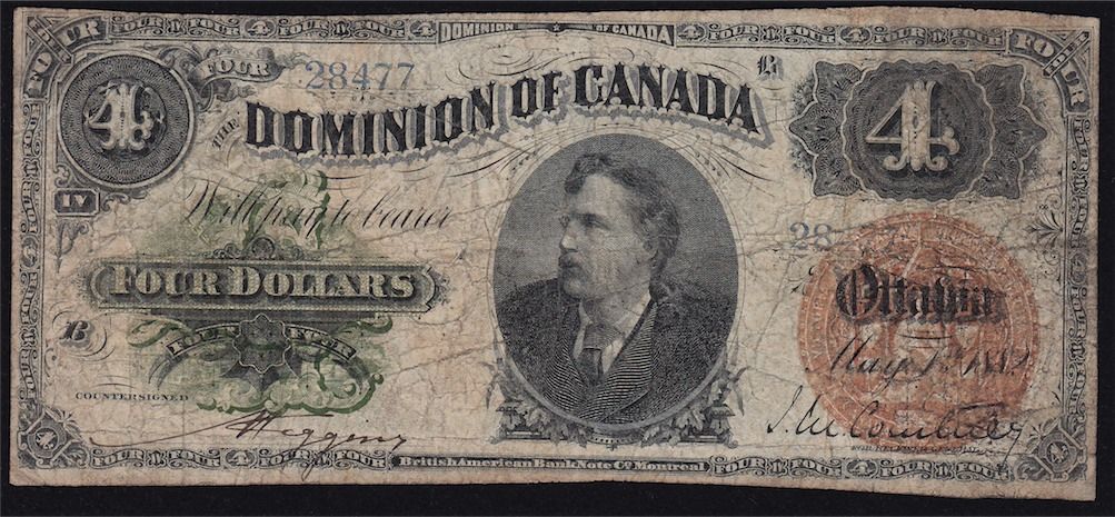 1882 Dominion of Canada $4 - CH DC-10 VG, pinholes and some small splits in the edges. Pressed S/N:28477/B.