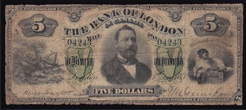 1883 Bank of London Five Dollars - CH 405-10-02. Pin holes and ragged edges but nevertheless VG and rarely offered complete. 13 notes on the registry (3 institutional). S/N: 04243/A.
