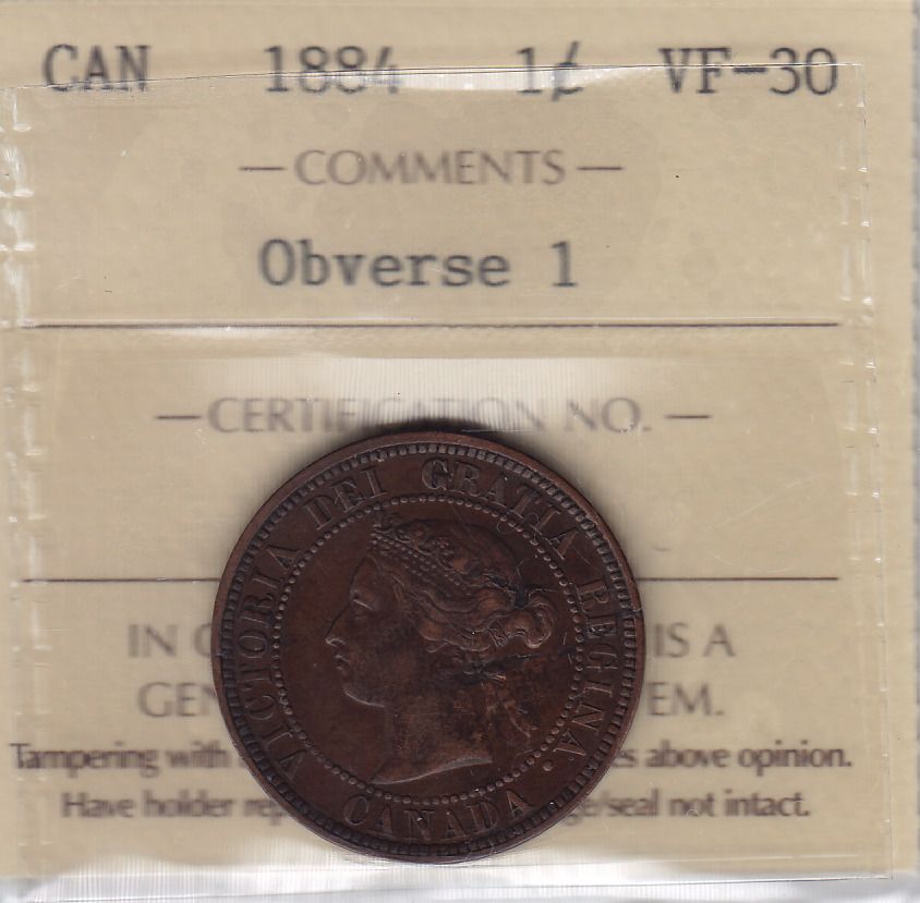 1884 One Cent. ICCS VF-30, rare obv. #1. Difficult to find above fine.