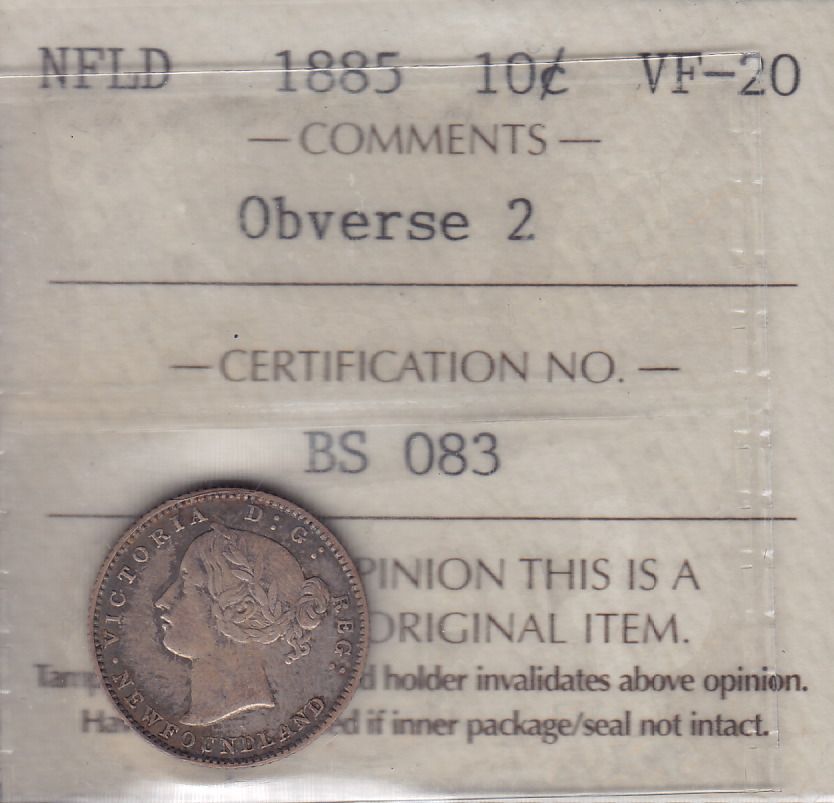 1885 Newfoundland Ten Cent - ICCS VF-20, Obverse 2.