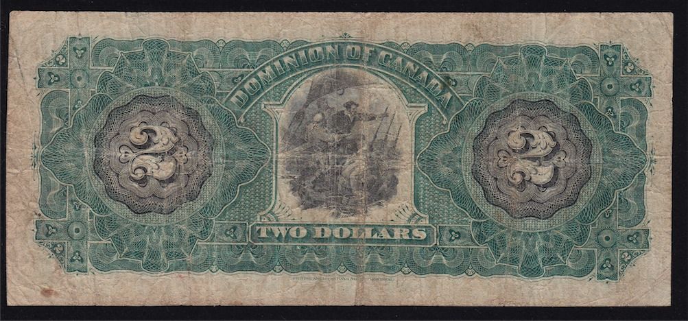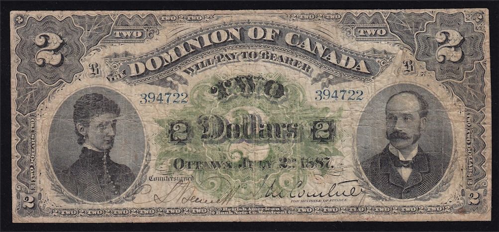 1887 Dominion of Canada $2 - CH DC-11 Fine, pressed. S/N:394722/B.