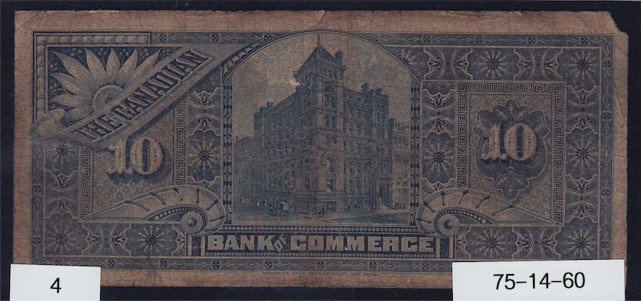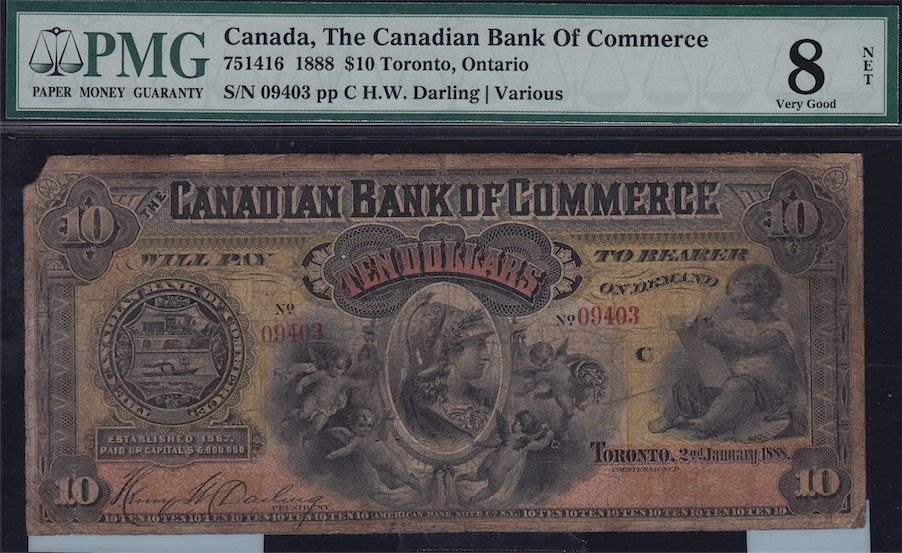 1888 Bank of Commerce $10. CH 75-14-16, PMG VG8, net. Corner tip missing, tears. 5 recorded on registry. S/N:09403/C.