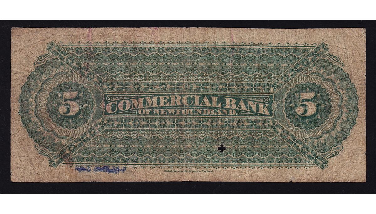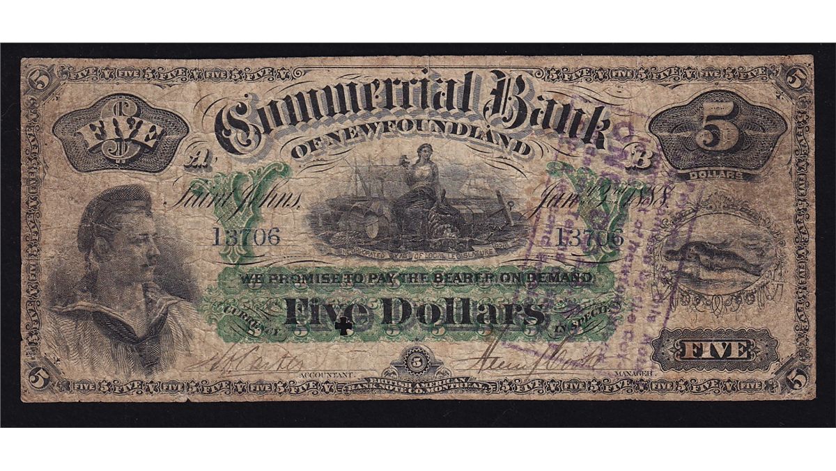 1888 Commercial Bank of Newfoundland $5 - CH 185-18-06, Fine, little writing on back, otherwise a nice clean note with Government stamp & maltese stamp, S/N:13906/A.
