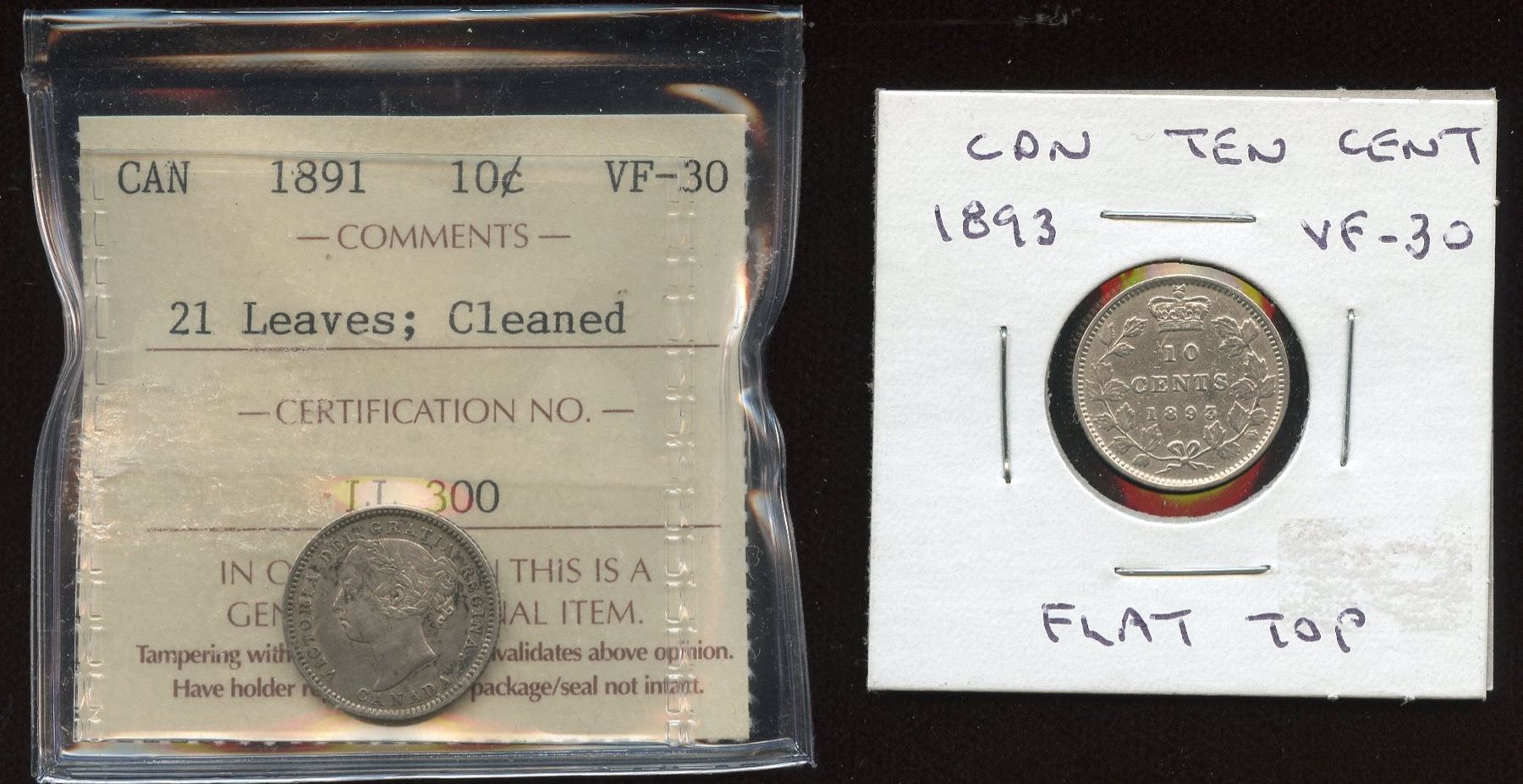 1891 VF-30. 21 Leaves; cleaned. 1893 VF, flat top, cleaned. 2 Pcs.
