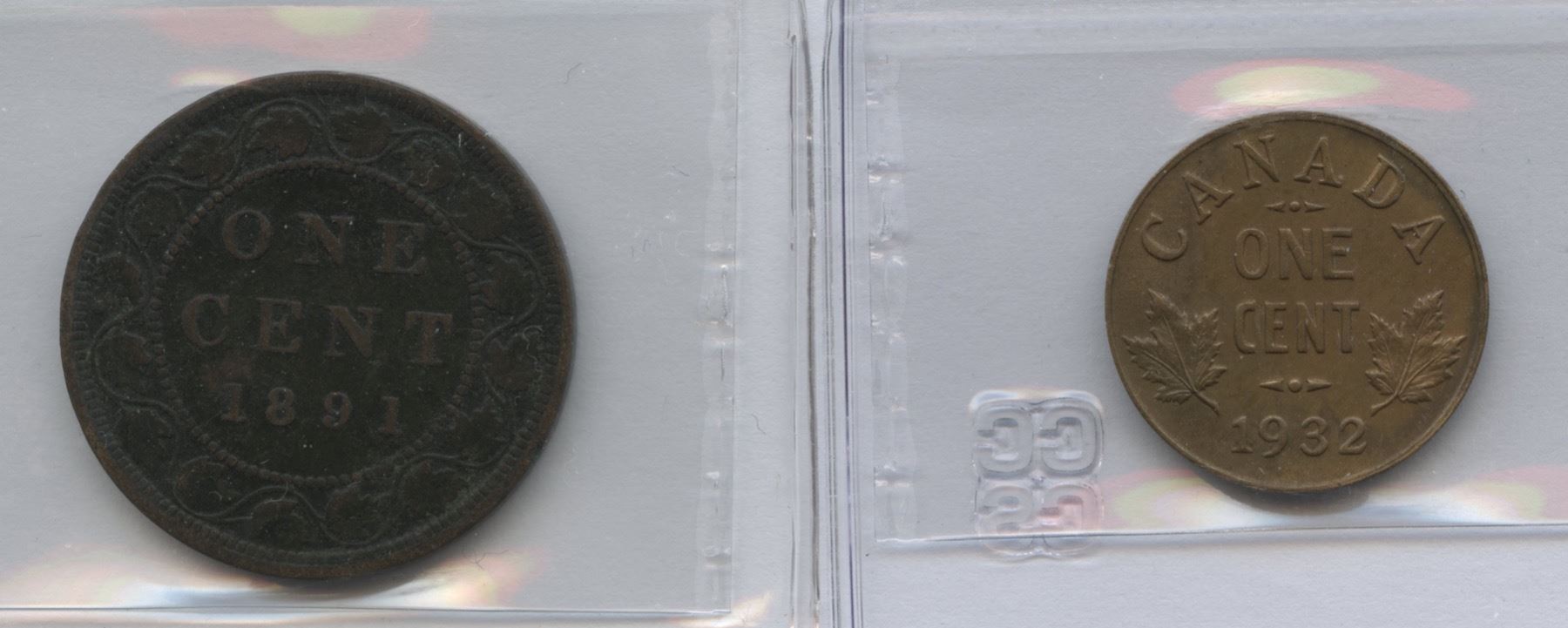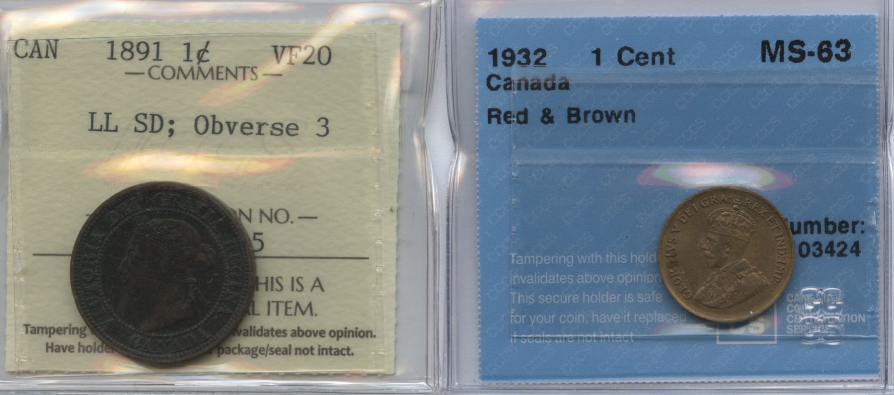 Includes: 1891 ICCS VF20, LL SD; Obverse 3. 1932 CCCS MS-63, Red & Brown. 2 pcs.
