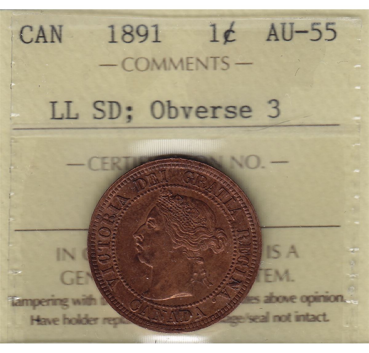 1891 One Cent ICCS AU-55,LL SD, Obverse 3.