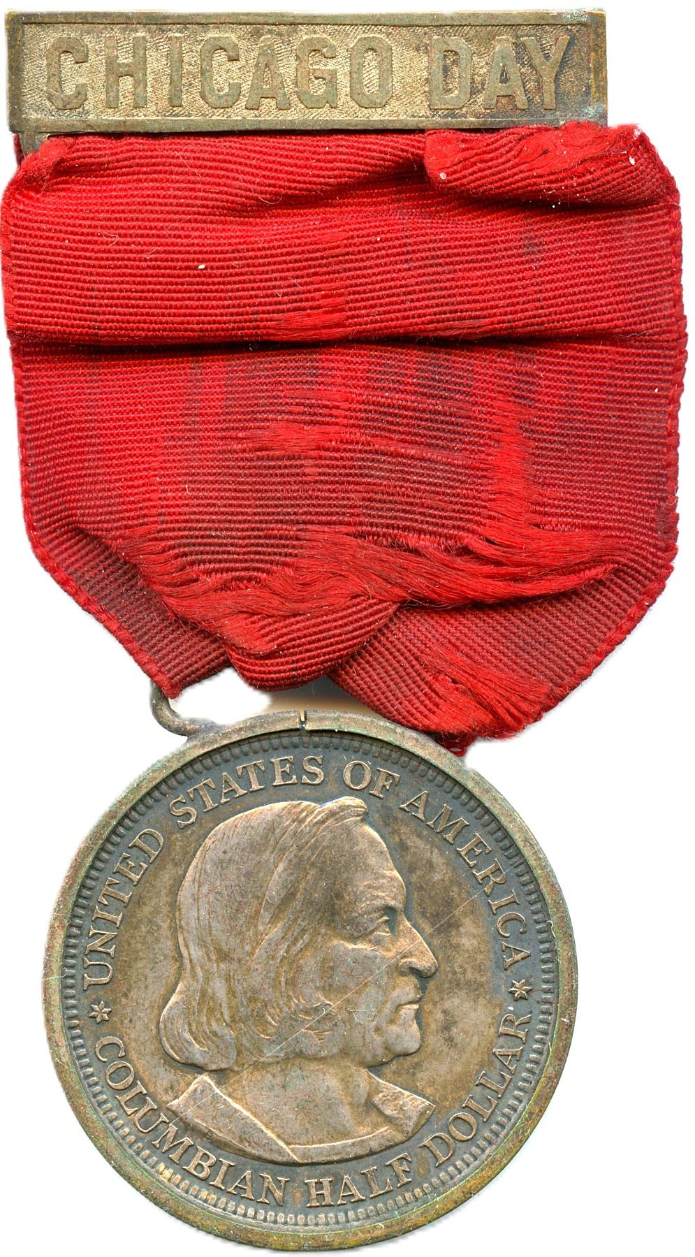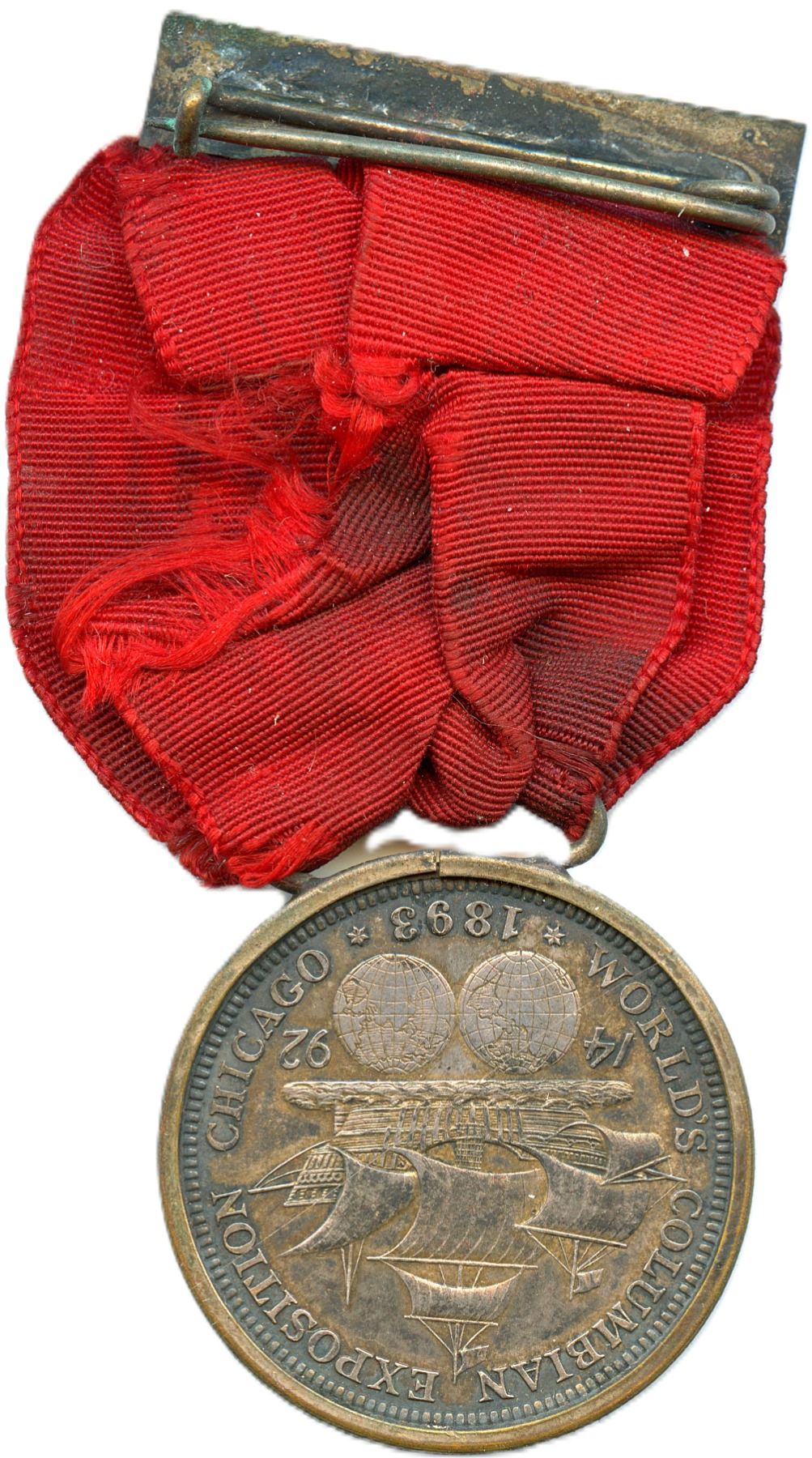 Chicago Day Suspension Hanger with red ribbon and bazel. EF. 1pc. Note: this lot is part of The Harry N. James Collection.