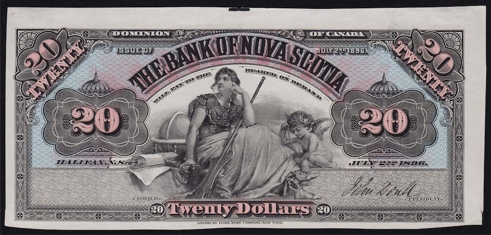 1896 Bank of Nova Scotia $20 Proof - CH 550-24-02P, No issued notes were produced of this note.