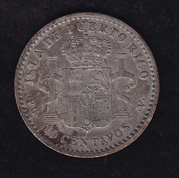 1896 Puerto Rico Ten Cent - SPANISH COLONY ALFONSO XIII. KM#21. Nice patina, VF, few minor scratches are present.
