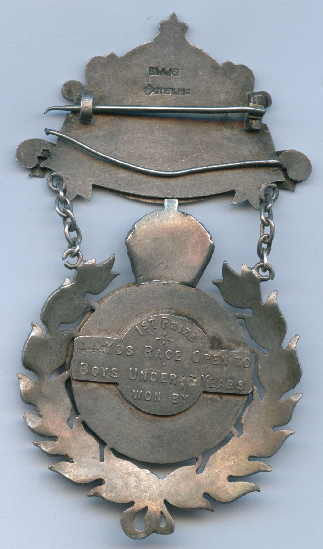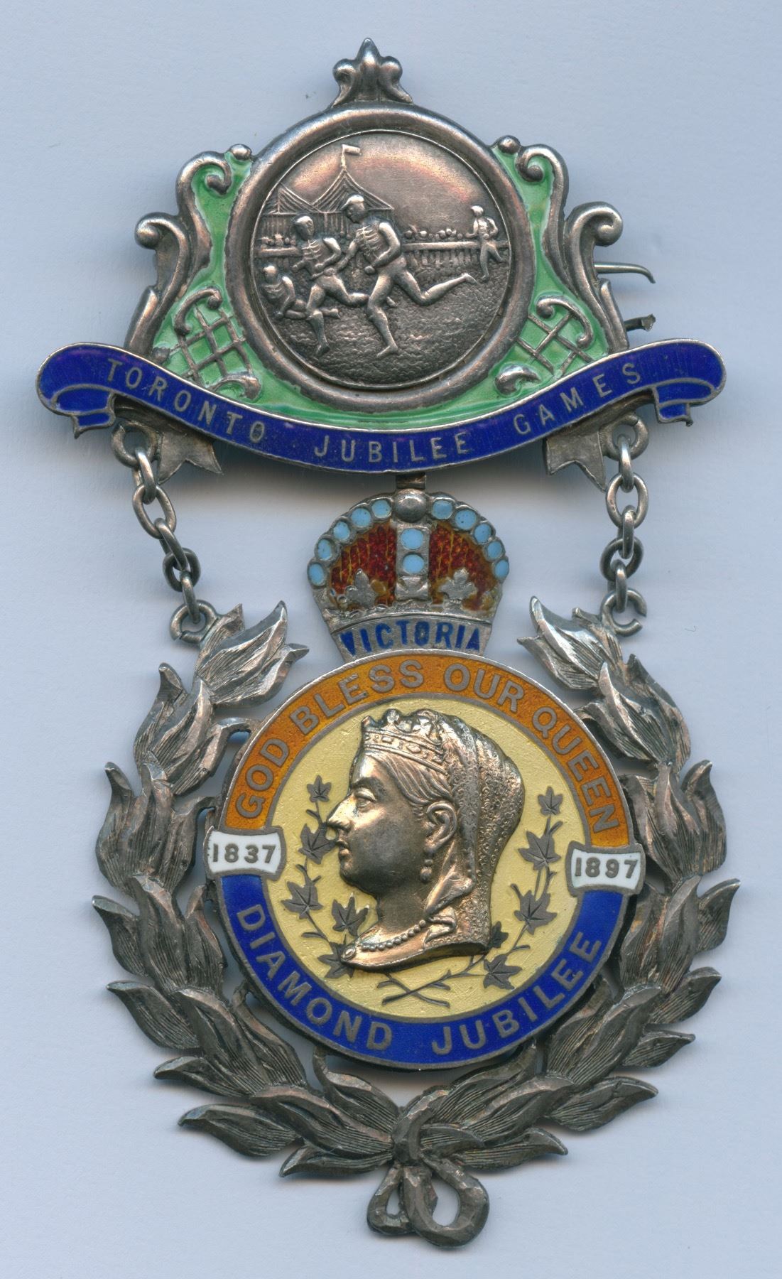 Silver, stamped "STERLING". 45mm x 81mm. 36.1g. Maker Mark: "ELLIS". Badge consists of 1. Bar Pin (a silver medallion depicting runners, laid on top of enamelled backing with "TORONTO JUBILEE GAMES" on a ribbon) 2. Medal (a laurel wreath surrounds a crowned, enamelled medal with bust of Victoria left and with a legend on the edge of "GOD BLESS OUR QUEEN / 1837 / 1897 / DIAMOND JUBILEE"). On the back of the medal, engraved on 4 lines is "1ST PRIZE / 440 YDS RACE OPEN TO / BOYS UNDER 1? YEARS / WON BY". Some wear on visible on both bar pin and medal.