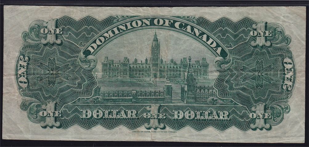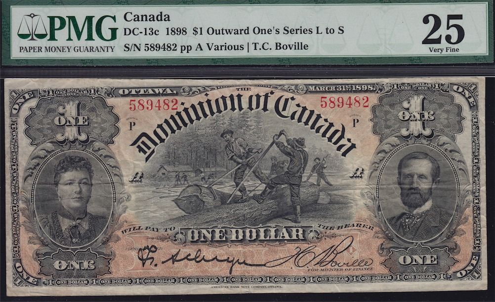 1898 Dominion of Canada $1 - CH DC-13c. Outward Ones, beautiful logging scene, PMG VF25. S/N:589482/P.