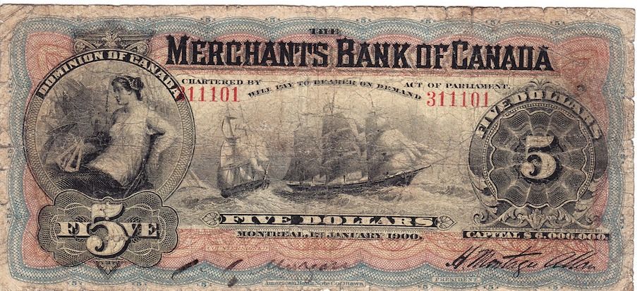 1900 Merchants Bank of Canada $5. - CH 460-14-04. VG with edge nicks and few pin holes. Fifteen known, one in institutional collection. Beautiful clipper vignette. S/N 311101.