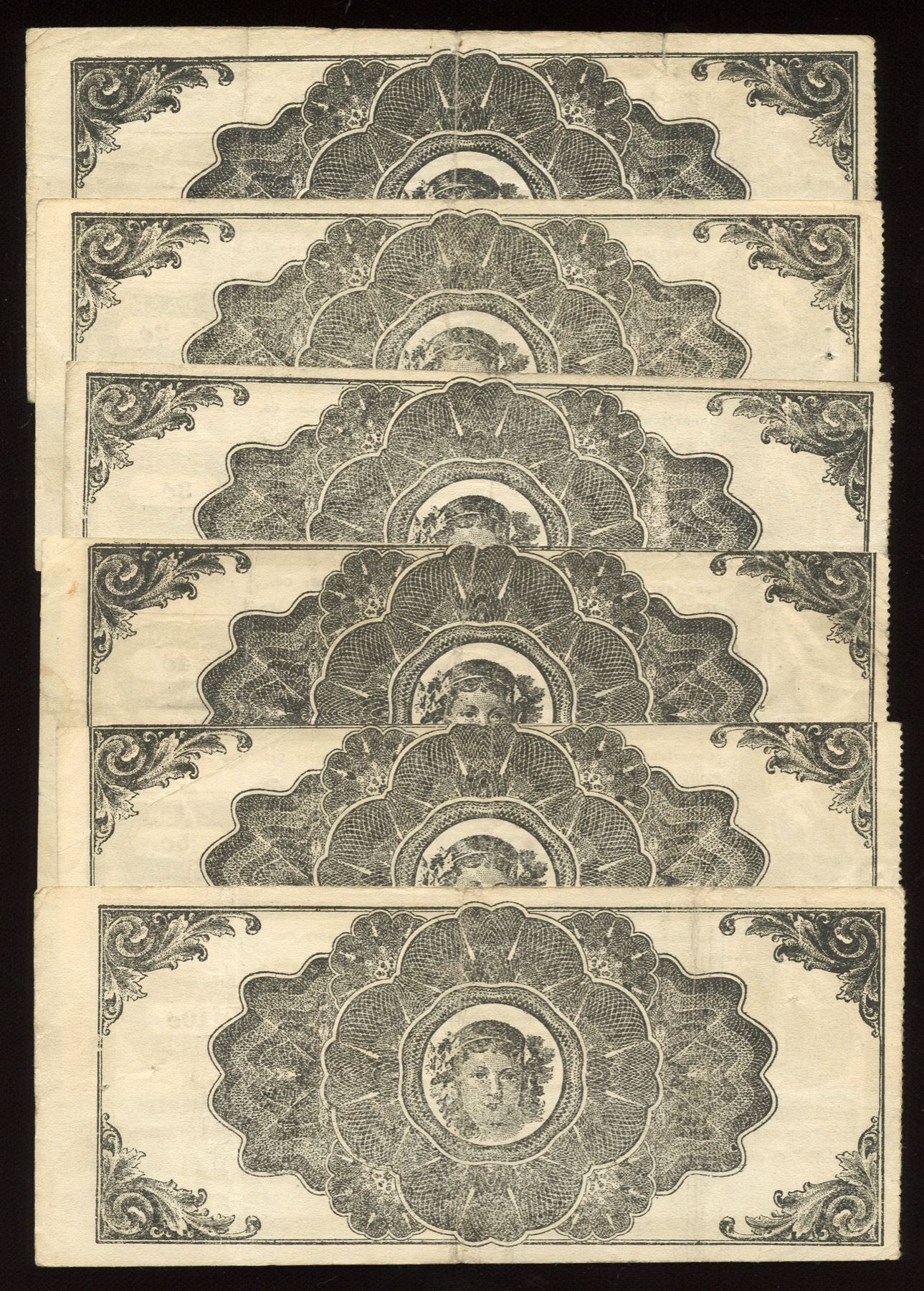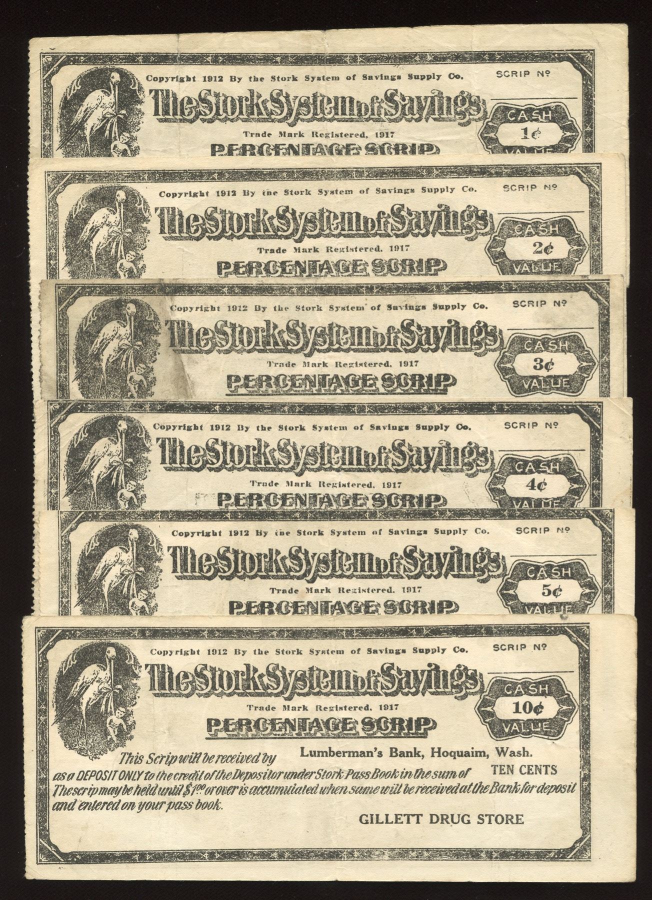 Compromising of 6 pieces, 1, 2, 3, 4, 5, 10 cents. "This scrip will be received by Lumberman's Bank, Hoquaim, Wash. as a deposit only to the credit of the depositor under Stork Pass Book in the sum of... Average Fine/VF. 6 Pcs.