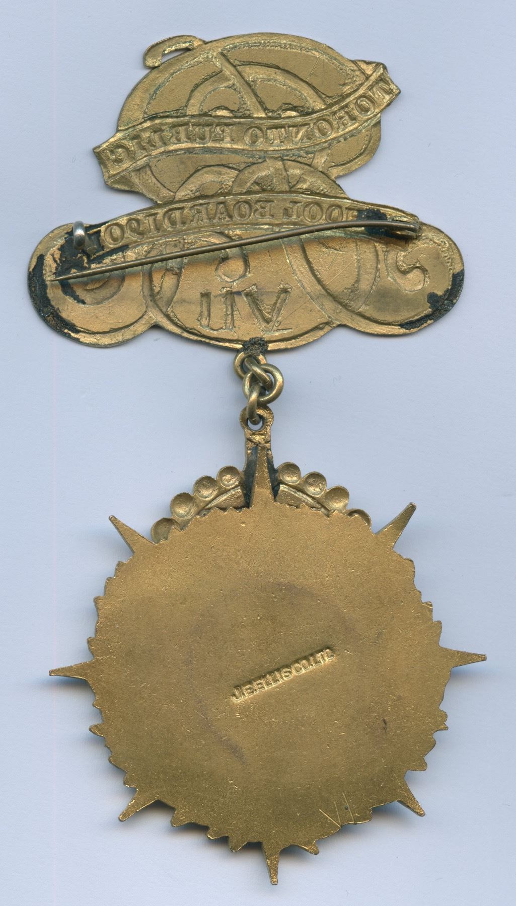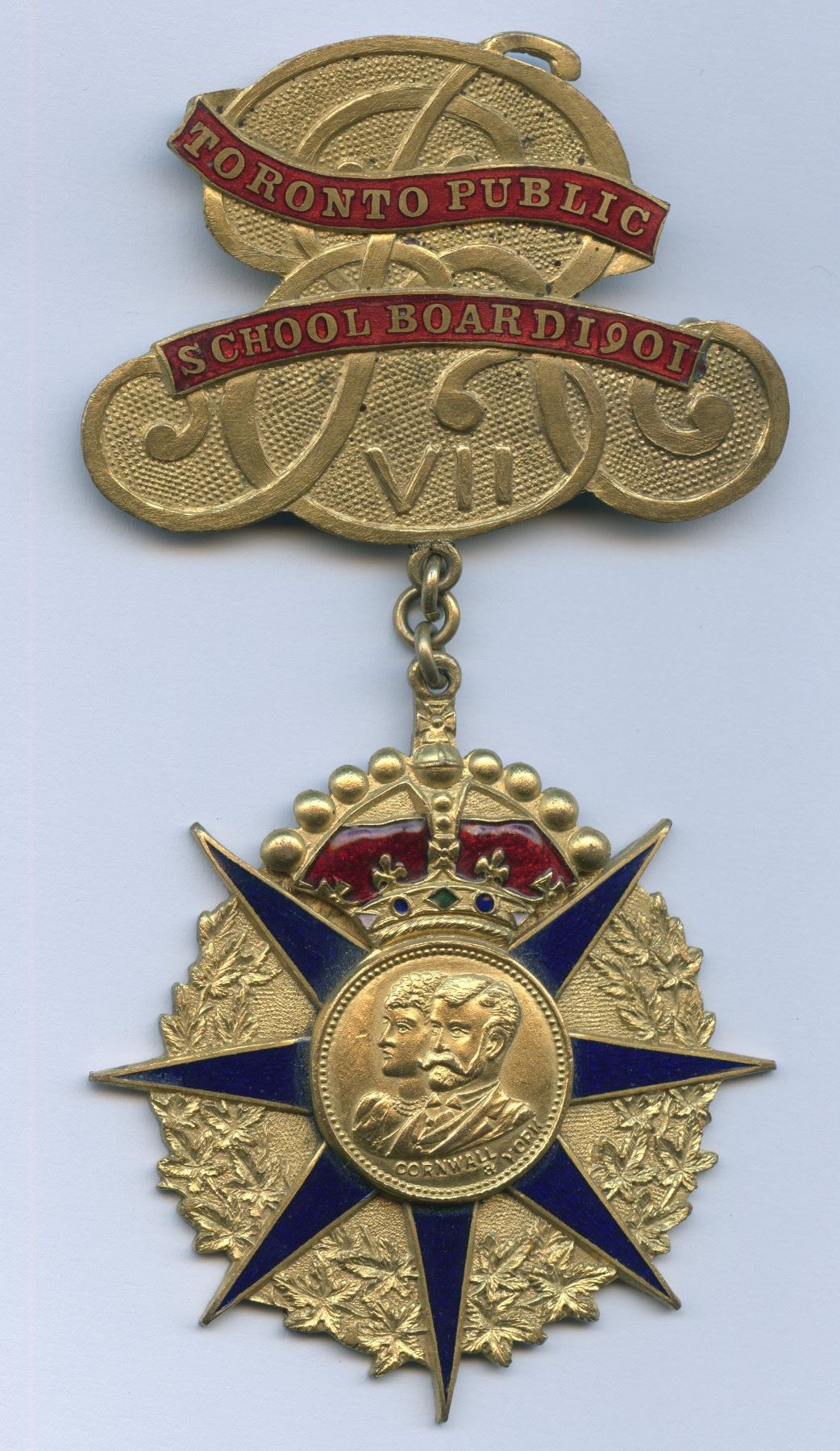 Gilt brass. 54mm x 107mm. 37.6g. Maker Mark: "J.E. ELLIS CO. LTD". Badge consists of: 1. Bar Pin ("TORONTO PUBLIC SCHOOL BOARD" on enamelled ribbon overtop of cipher for Edward VII) 2. Medal (the jugate busts of the Duke and Duchess of Cornwall & York on a crowned round button at the center of a 7-point star, all of which is overlaid on a wreath of maple leaves). Lightly rubbed on high points of bar pin and medal - gilding is fully intact.