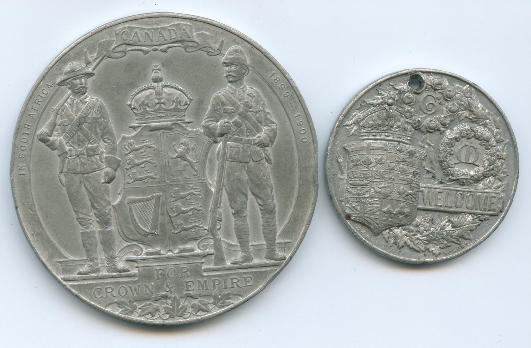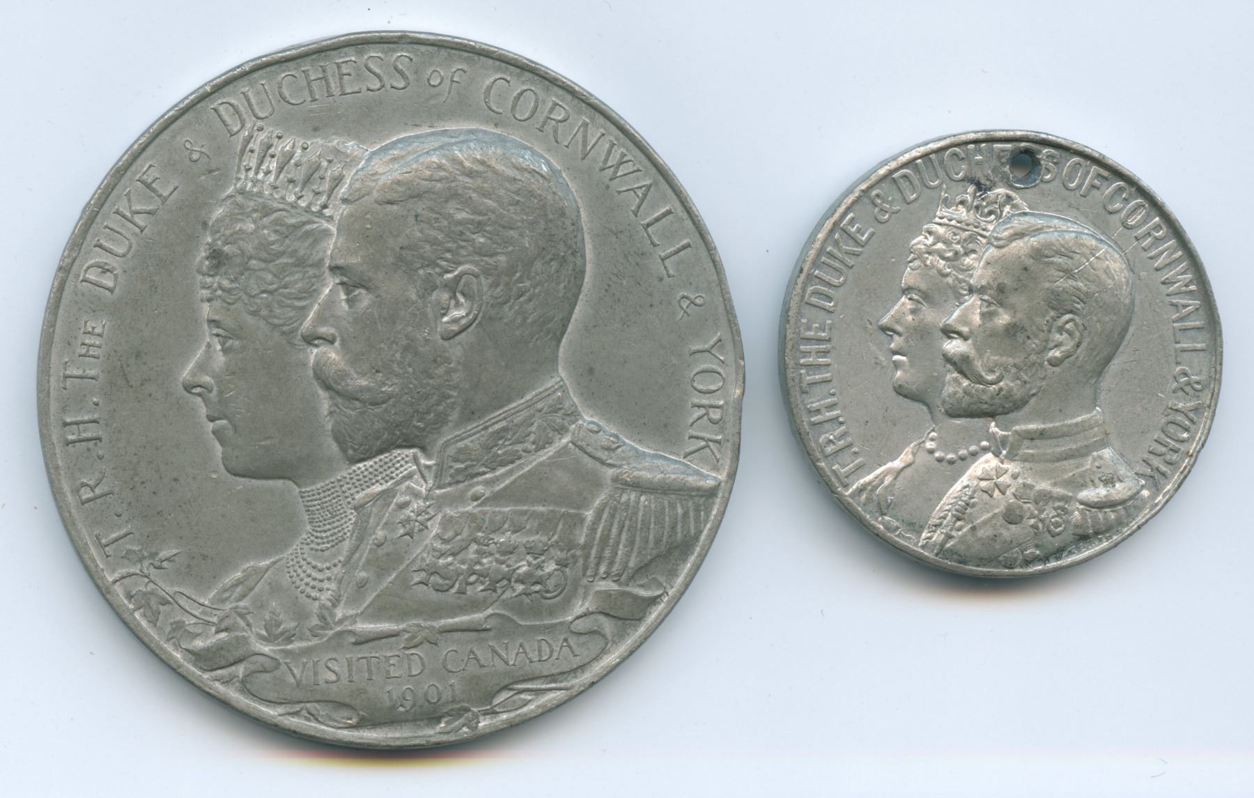 The 1901 Royal Tour by the Duke and Duchess of Cornwall and York (the future King George V and Queen Mary) was a significant event in Canadian history. white metal, large + small, welcome Home medal from war. P.W.Ellis. 2 pcs.