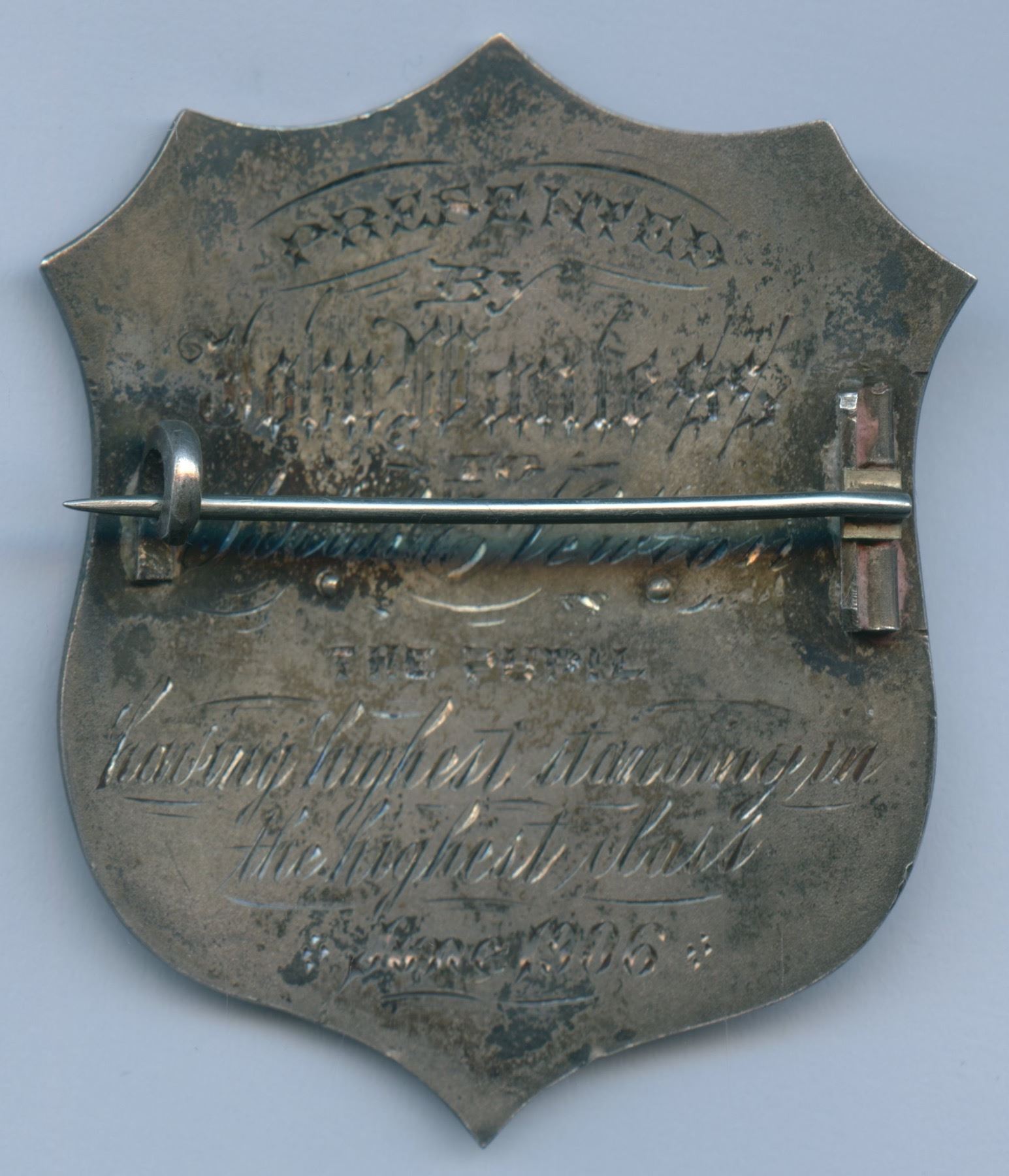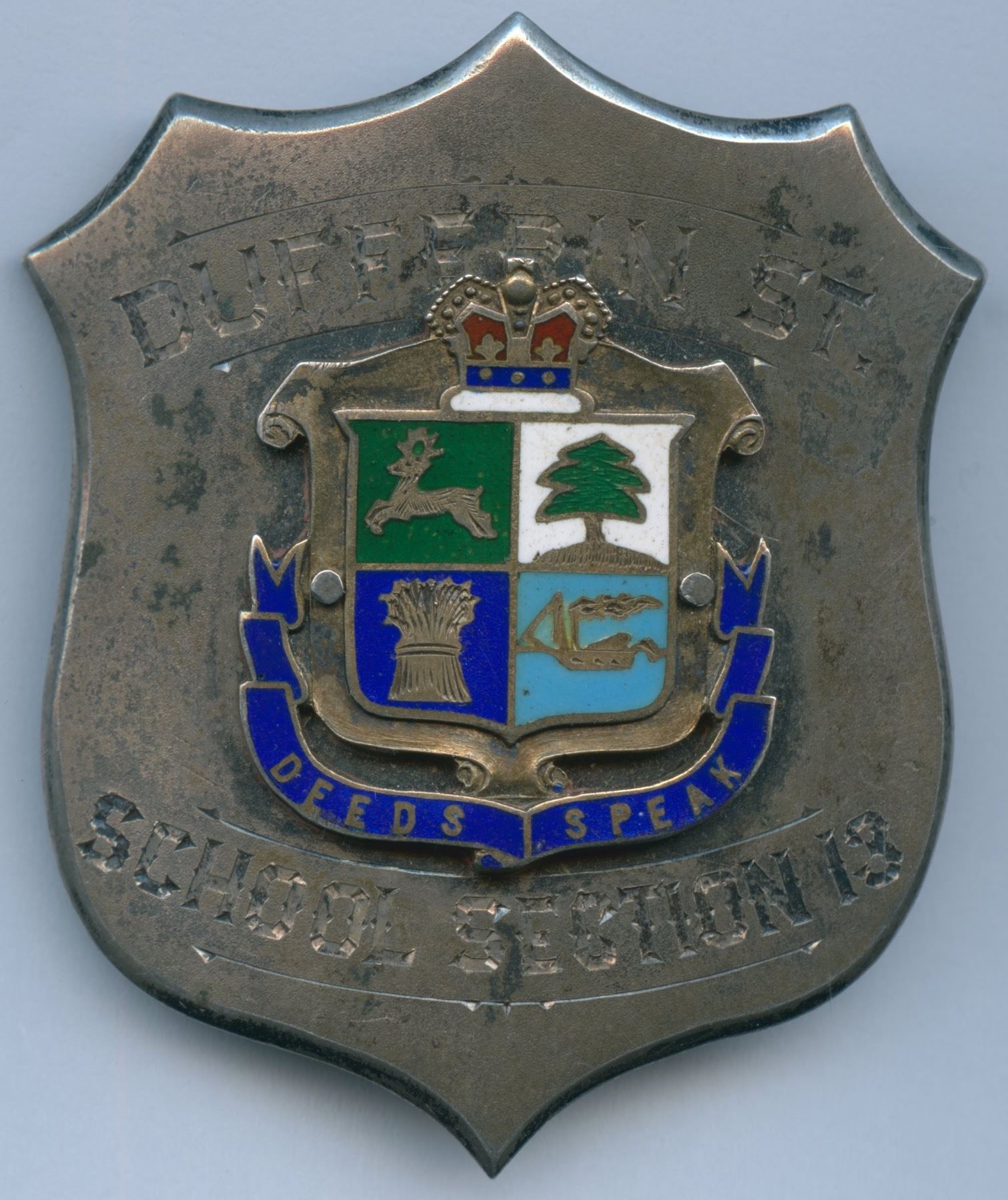 Silver, sterling. 45mm x 53mm. 30.7g. No Maker Mark. Award is in the shape of a 6-point law enforcement badge. Front has enamelled crowned school crest in the center, "DUFFERIN ST. / SCHOOL SECTION 13" engraved above and below crest. Back has engraved on 9 lines "PRESENTED BY / John Wanless / TO / Sarah E. Newton / THE PUPIL / having the highest standing in the highest class / June 1906". Additionally a pin-back across the entire width. Spots of wear on high points of the crest.