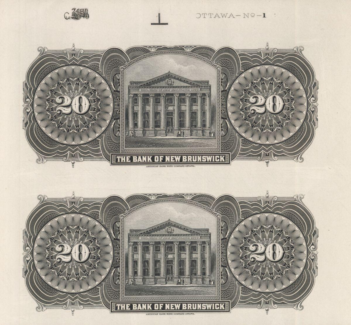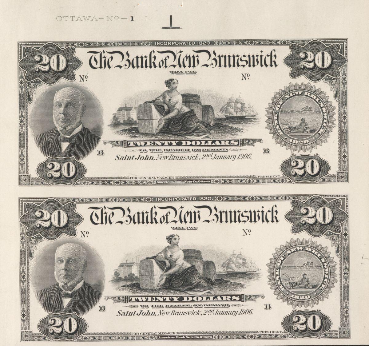1906 Bank of New Brunswick $20 Uncut Sheet of Two