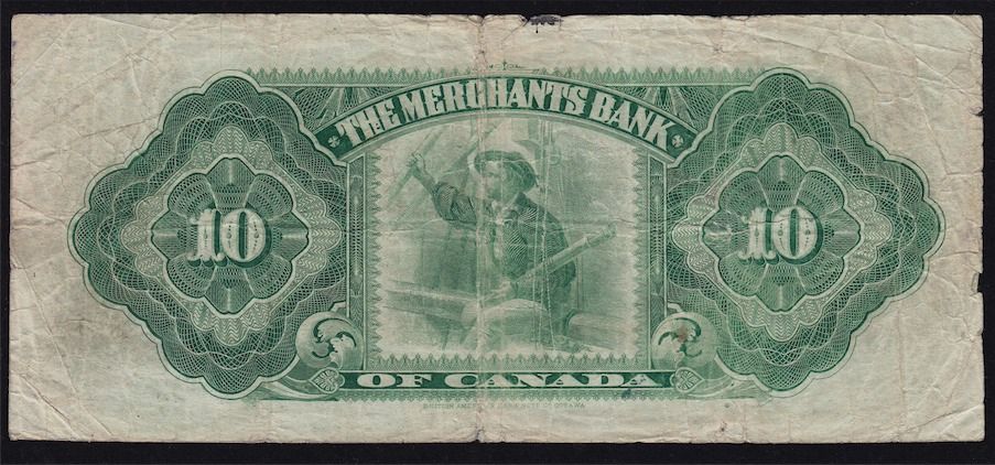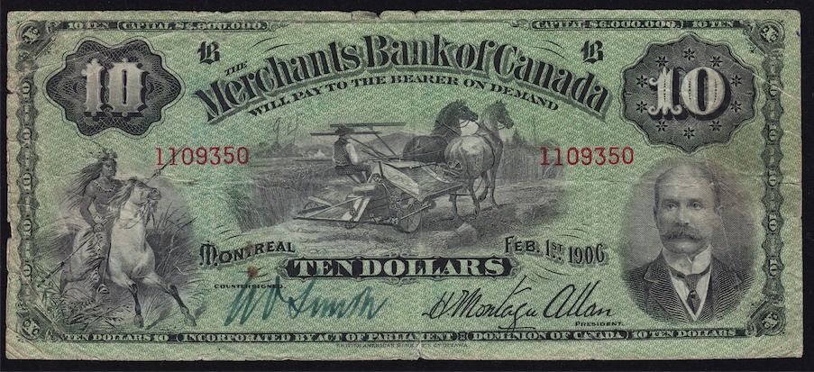 1906 Merchants Bank of Canada $10. CH 460-16-04, Gorgeous vignette, AVF, soft left side. S/N:1109350/B.
