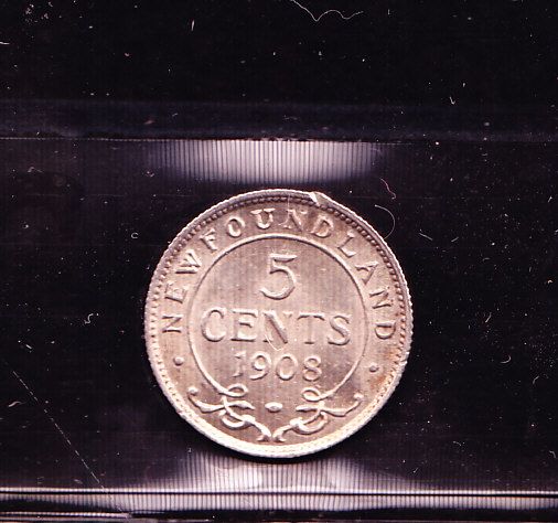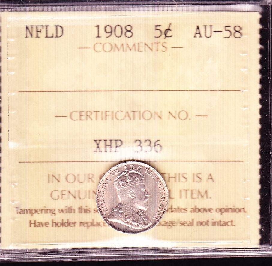 1908 Newfoundland Five Cent - ICCS AU-58.
