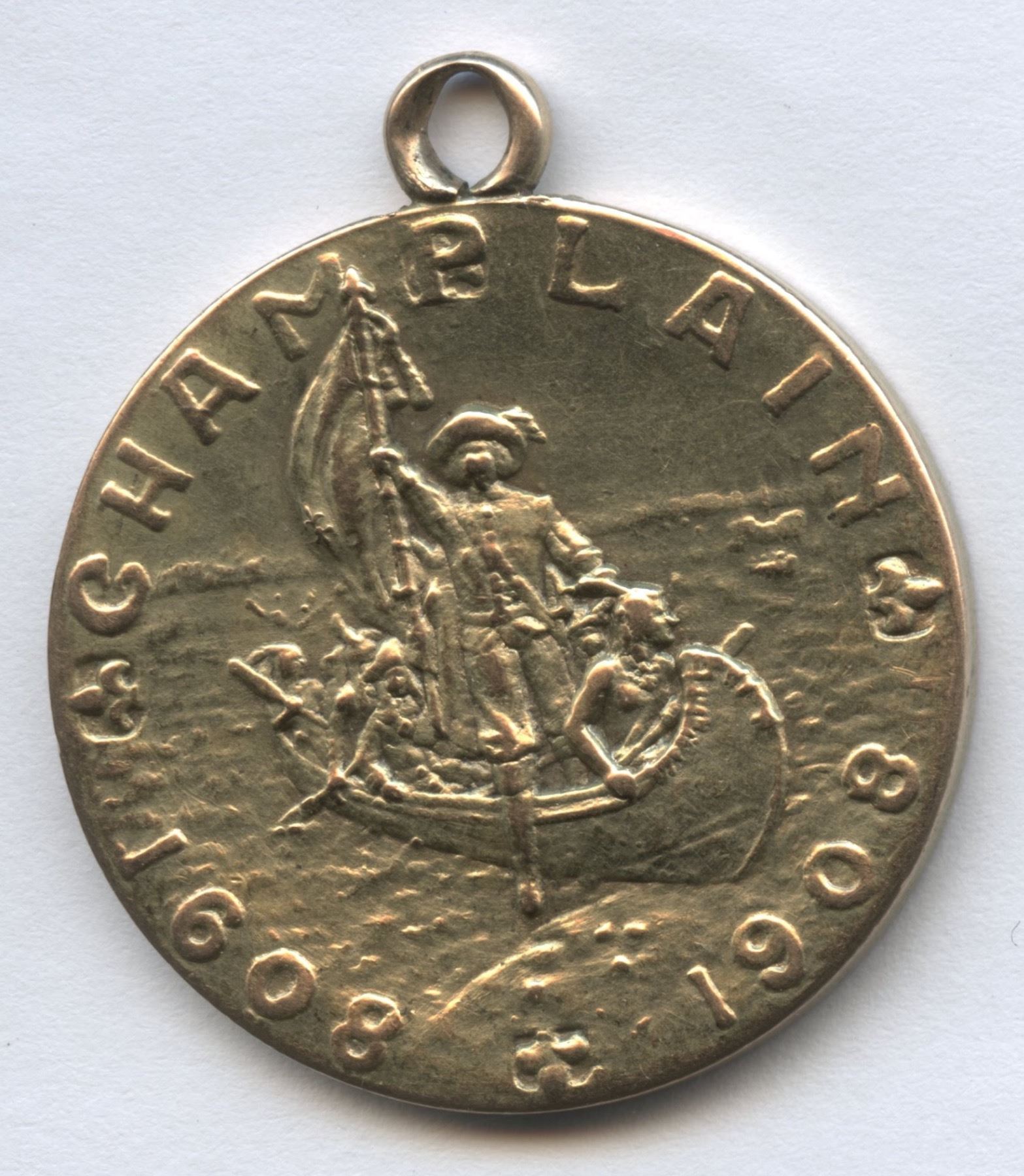 1608-1908 Champlain medal on a loop at 12 o'clock. 31mm. 16.73gms, 14k.