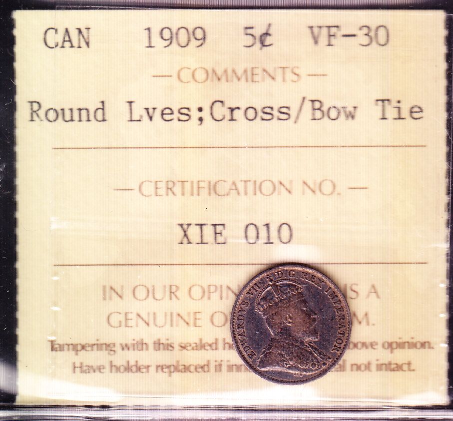 1909 Five Cent - ICCS VF-30, Round leaves; Cross/Bow Tie, Scarce Variety.