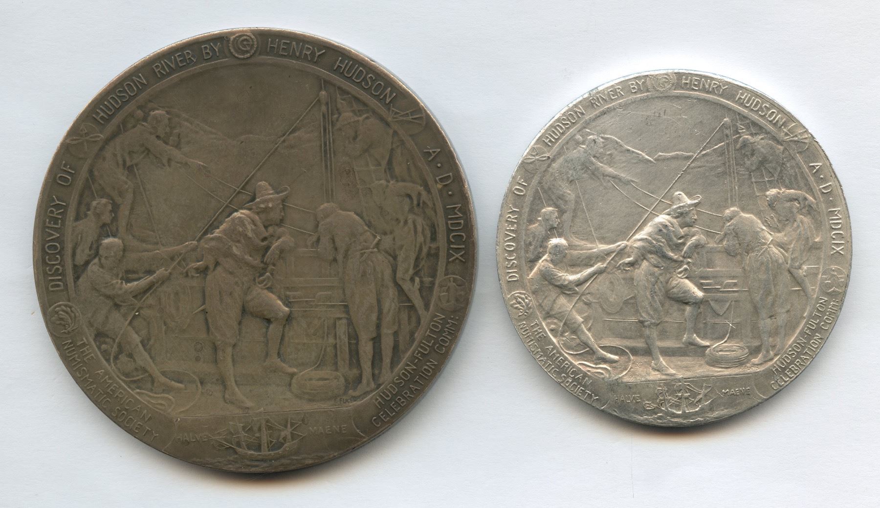 Includes: 1909 Official Medal of the Hudson-Fulton Celebration, sterling silver, 63.5mm. 1909 Hudson-Fulton Tercentenary Celebration Souvenir, sterling silver, 32mm. 2 pcs.