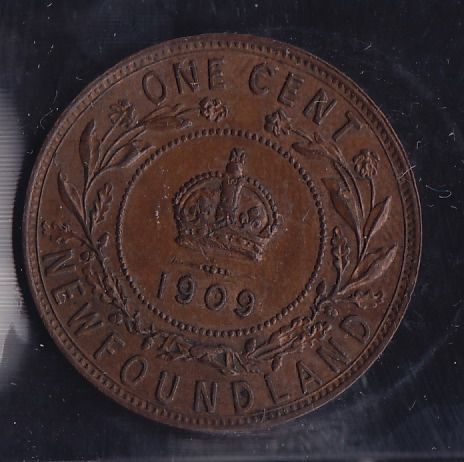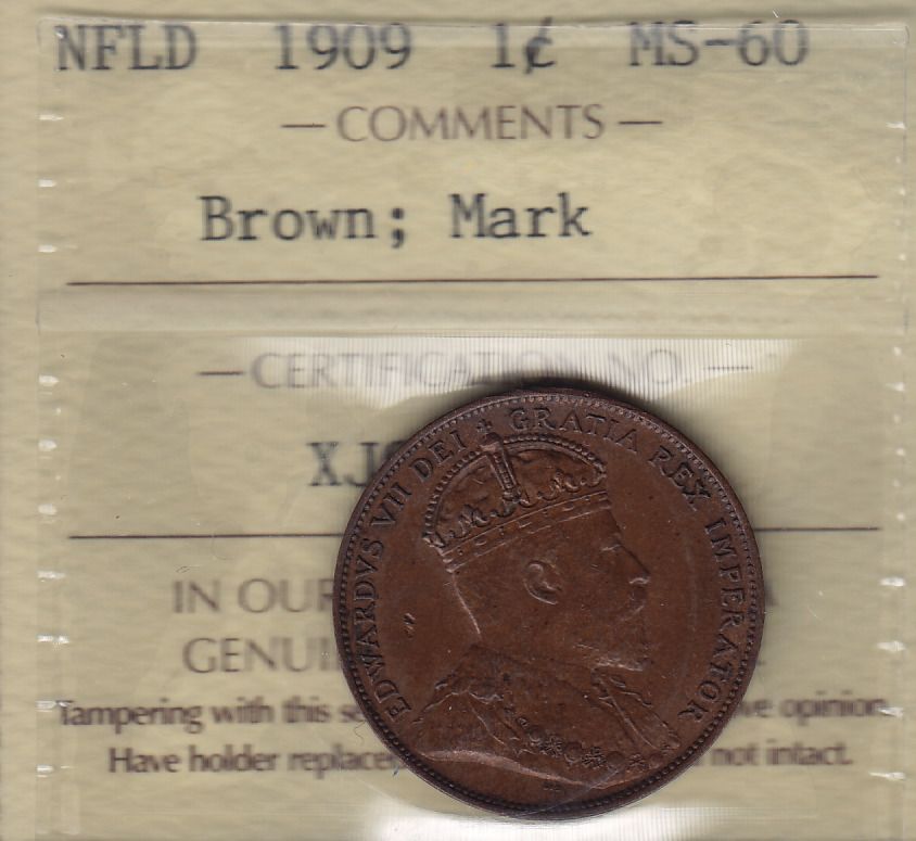 1909 Newfoundland One Cent - ICCS MS-60 Brown; mark.