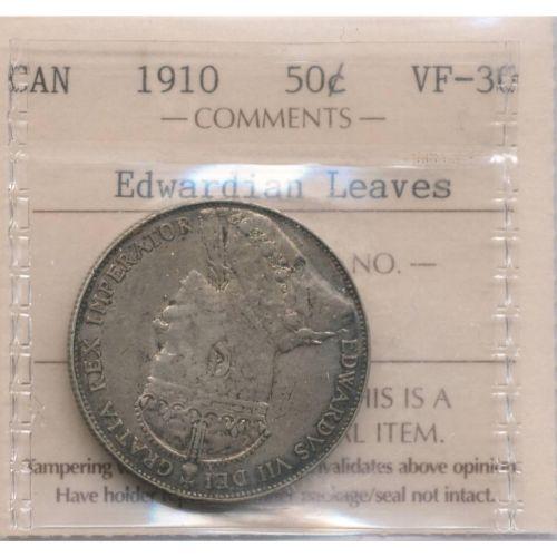 1910 Canadian 50 Cent ICCS VF-30<BR><BR>Edwardian Leaves variety, nice original toning